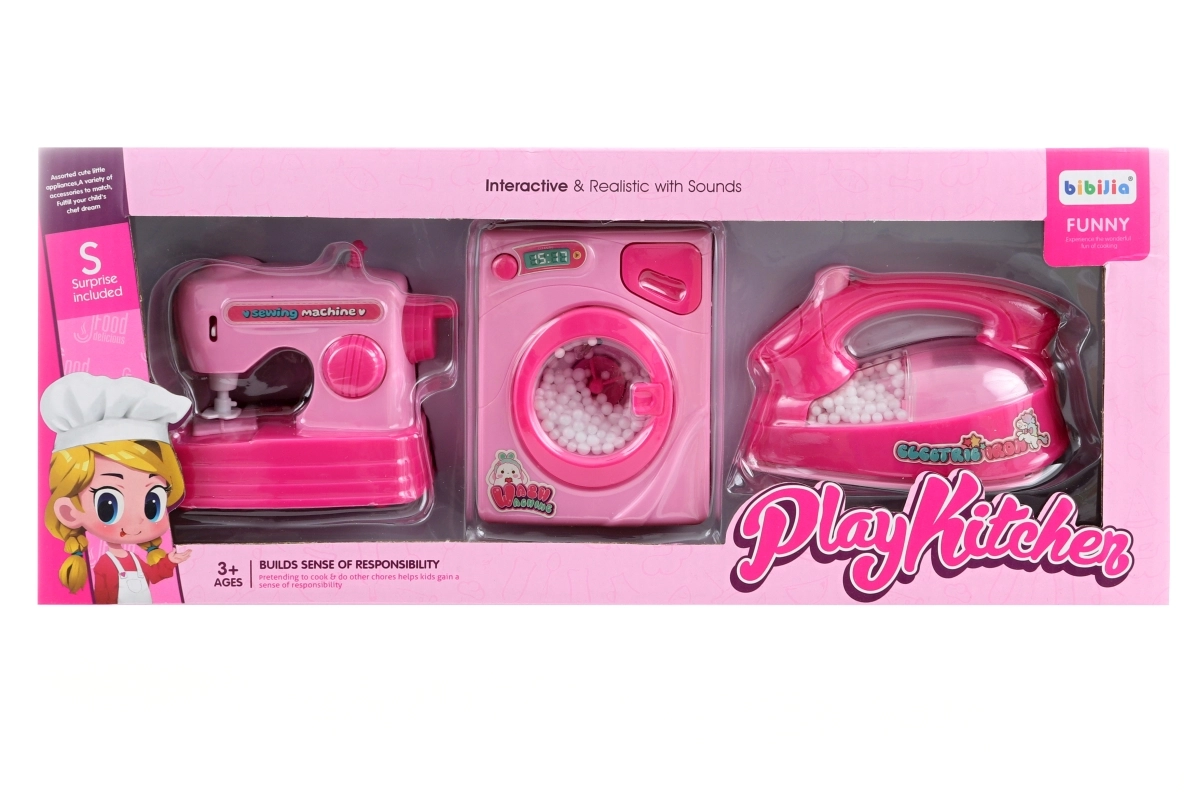 Set distractiv de electrocasnice pentru micii ajutoare, cu funcții realiste și joc în siguranță. Fier de călcat cu lumină și sunet, mașină de spălat cu tambur rotativ și mașină de cusut care imită mișcarea reală stimulează imaginația și dezvoltarea motricității fine. Fiecare aparat este alimentat de 2× baterii AA (neincluse). Potrivit pentru copii de la 3 ani.