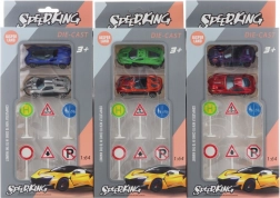 Distractiv set de mașinuțe metalice cu semne rutiere din plastic realiste pentru micii șoferi. Excelent pentru dezvoltarea imaginației și învățarea regulilor de circulație, ideal ca cadou pentru copii de la 3 ani.
