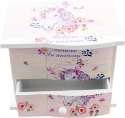 Cutia are închidere cu cheiță, astfel încât comorile copiilor rămân în siguranță. Construcția solidă din lemn și motivul adorabil cu unicorn se potrivesc de minune în camera celor mici. Dimensiunile compacte permit așezarea facilă pe raft sau pe măsuță, oferind totodată suficient spațiu pentru prima colecție de bijuterii.