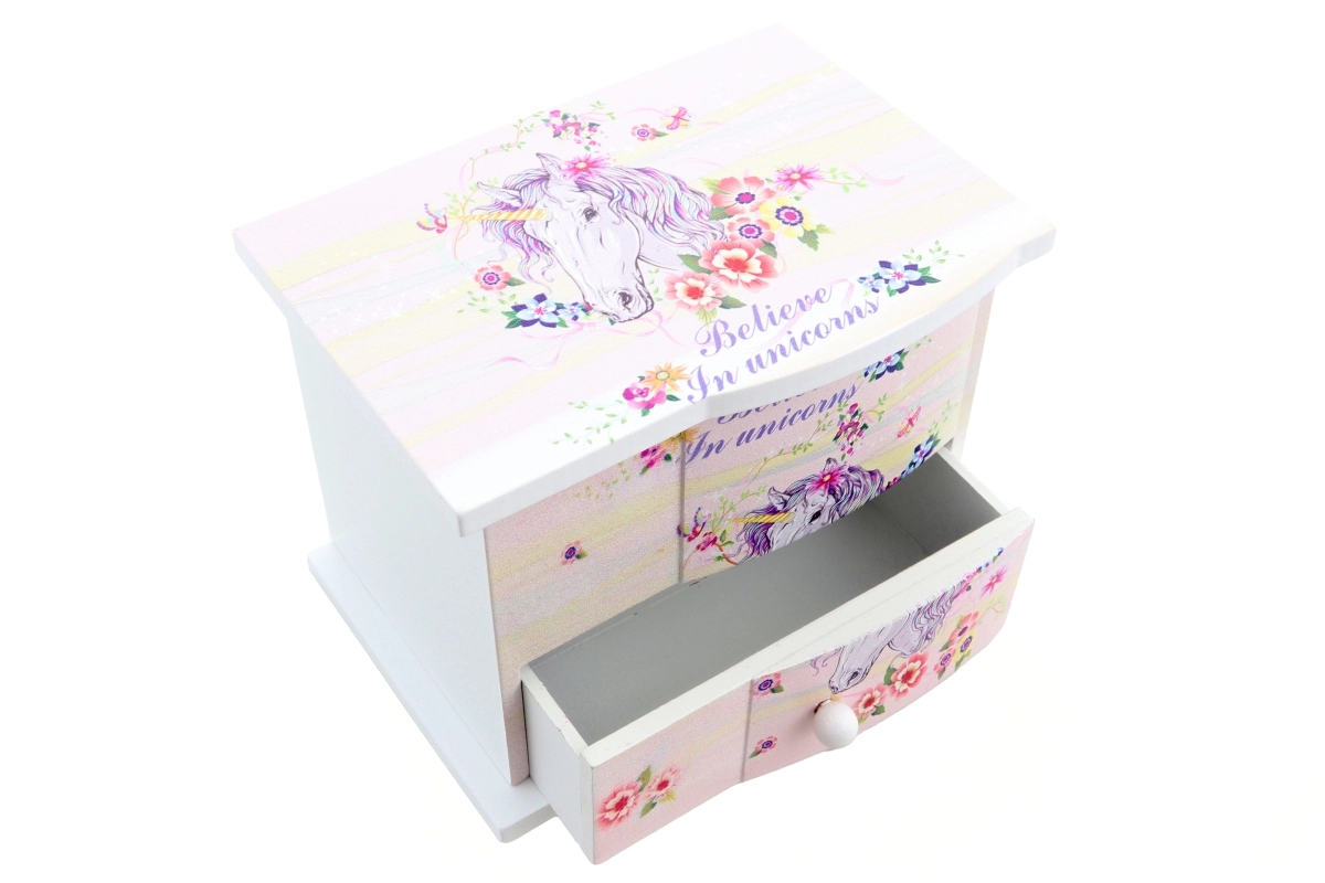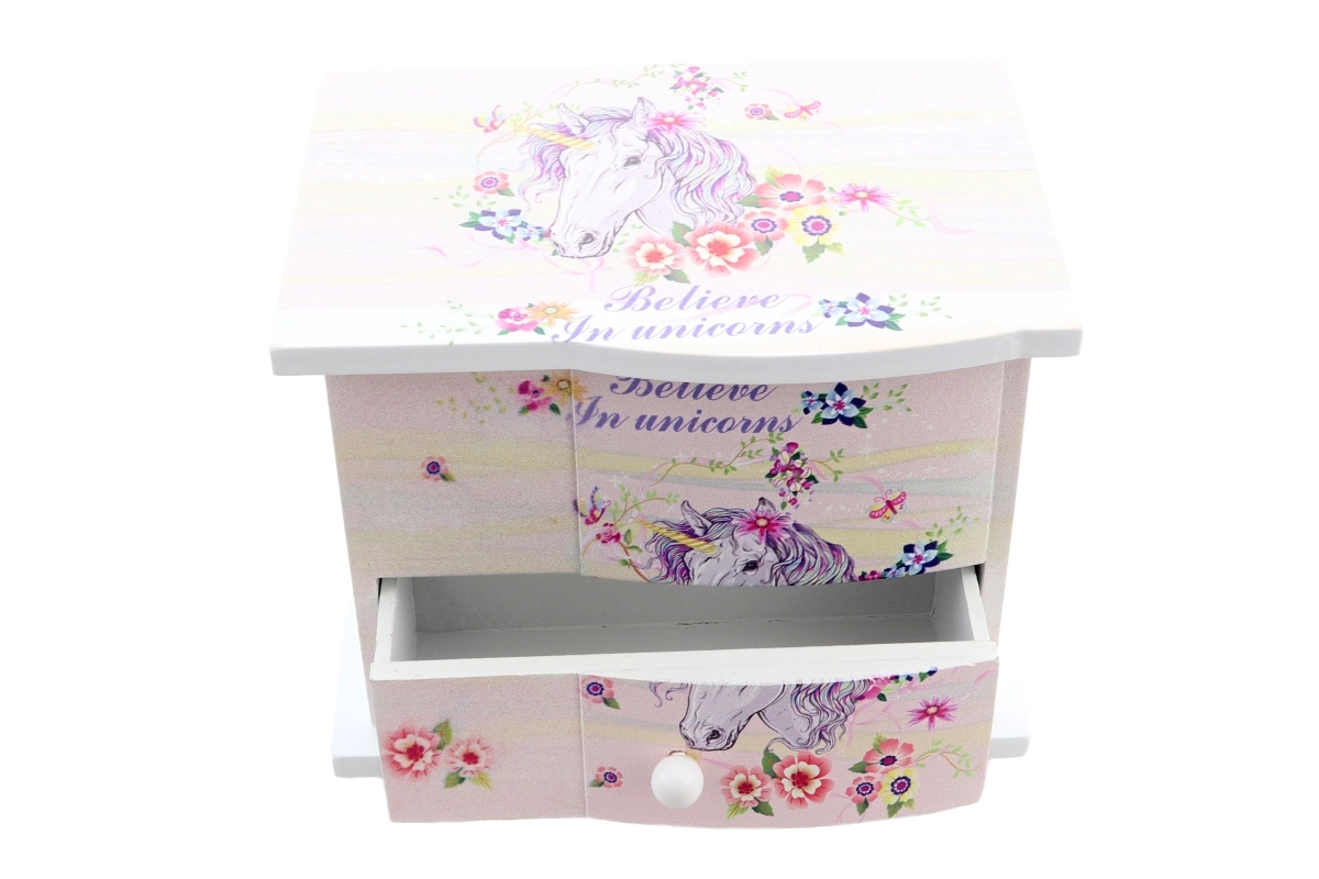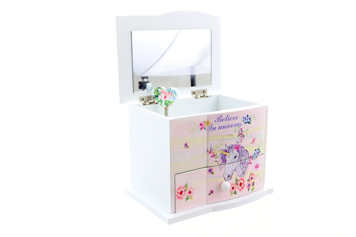 Această fermecătoare cutie de bijuterii din lemn, cu motiv de unicorn, protejează perfect comorile copiilor – inelele, brățările și micile secrete. La deschiderea capacului, se învârte inimioara și se aude o muzică delicată, care aduce zâmbetul de fiecare dată. Partea superioară ascunde o oglindă practică pentru probarea rapidă a bijuteriilor, iar jos veți găsi un sertar pentru alte mărunțișuri.