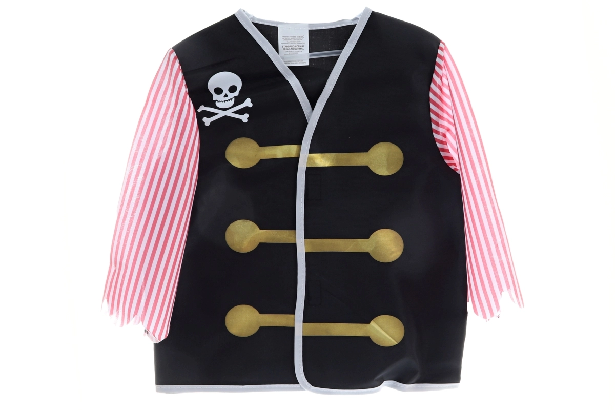 Acest costum de pirat pentru copii transformă micii aventurieri în căpitani de echipaj. Setul conține tot ce este necesar pentru deghizări stilate și joacă imaginativă – pelerină emblematică cu motiv craniu, pălărie de pirat, plasture pentru ochi, sabie și telescop (decorativ, nefuncțional). Datorită materialelor ușoare, costumul este plăcut de purtat și ușor de îmbrăcat.
