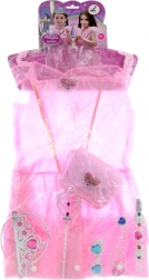 Coroană, baghetă, colier, brățări, cercei, inele și poșetuță – toate asortate în tonuri de roz pentru un costum perfect.