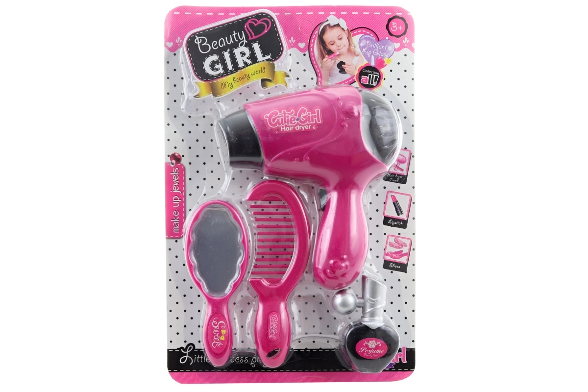 Dezvoltă creativitatea micilor coafeze cu acest set complet pentru joc de salon. Conține foen pe baterii, oglindă, pieptene și sticluță pentru parfum – totul ideal pentru primele coafuri și jocuri de rol distractive. Foenul este alimentat de 1× baterie AA (nu este inclusă). Potrivit pentru copii de la 3 ani.