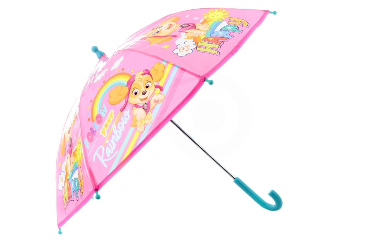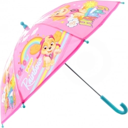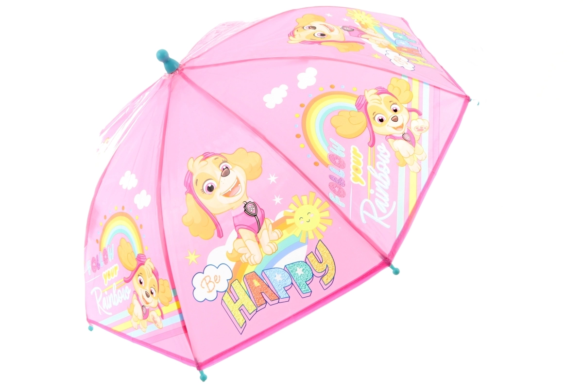 Această umbrelă roz stilată, cu imagini vesele cu cățeluși, curcubeie și inscripții precum „Be Happy” și „Follow your Rainbow”, va bucura orice mic fan al PATRULEI CĂȚEILOR. Datorită formei de cupolă oferă protecție fiabilă împotriva ploii și arată grozav.
