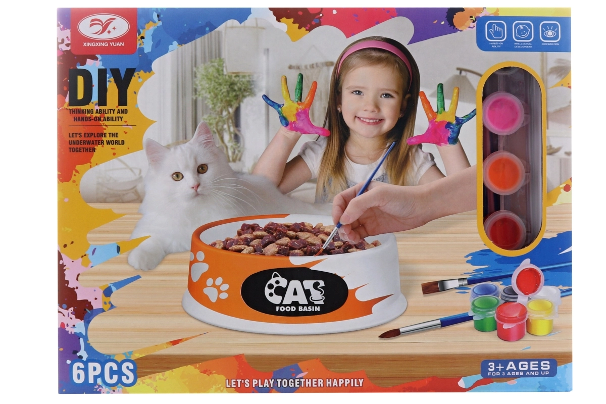 Sunt incluse 6 culori, 2 pensule și o paletă de pictură, astfel încât copiii pot combina culorile, amesteca nuanțele și crea motive originale. Bolul final este nu doar frumos, ci și funcțional ca bol pentru hrană sau apă pentru pisică.