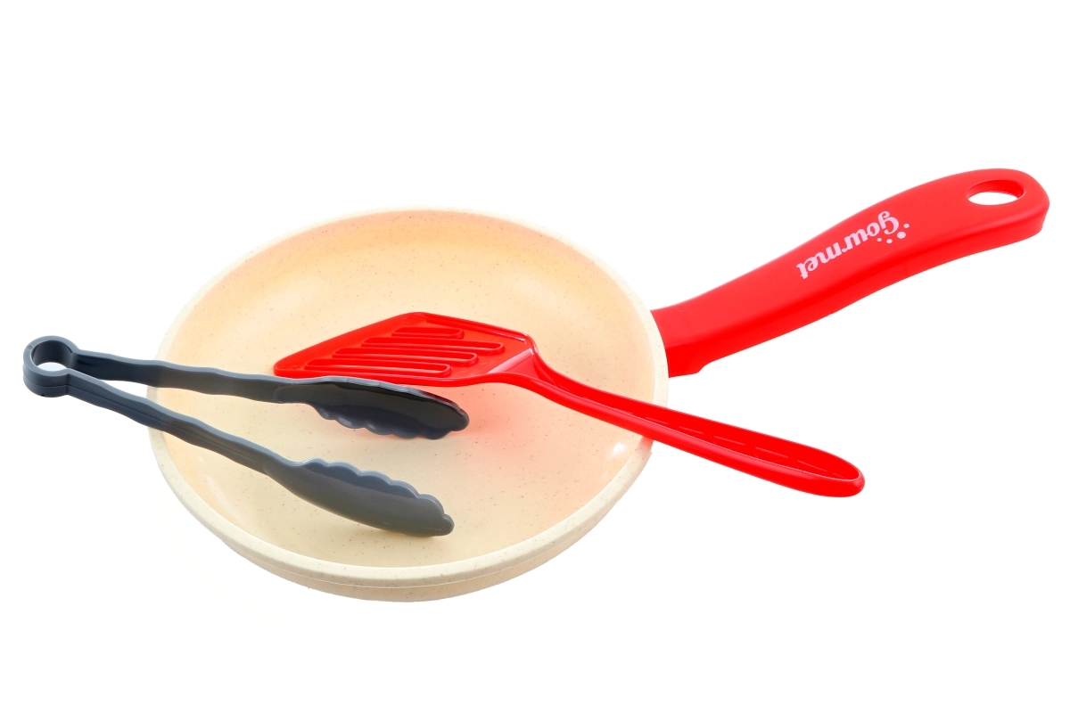 Tigaia cu mâner roșu, spatula cu fante și cleștele din plastic rezistent sunt concepute pentru a fi ușor de ținut și utilizate în siguranță.