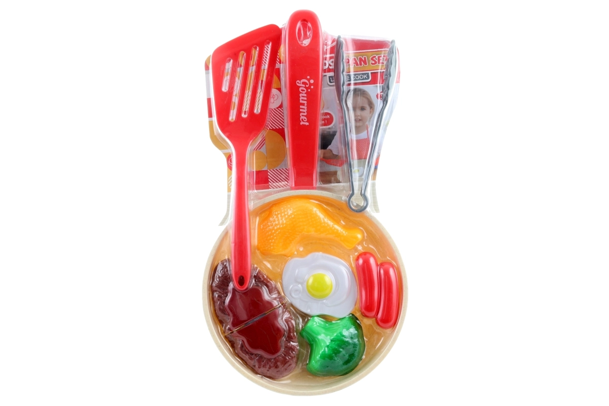 În pachet găsiți tot ce aveți nevoie: tigaie, spatulă, clește și 5 piese alimentare (de ex. ou, friptură, crenvurști, pește sau legume). Setul este realizat din plastic de calitate și este potrivit pentru copii de la 3 ani.