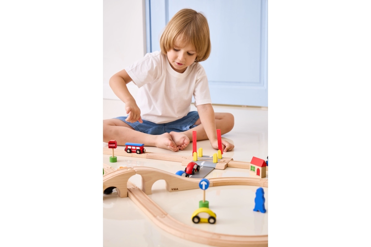 Structura masivă din lemn și piesele rezistente fac față jocului zilnic. Accesoriul ideal pentru seturi de joacă cu trenulețe, mașinuțe și indicatoare rutiere.