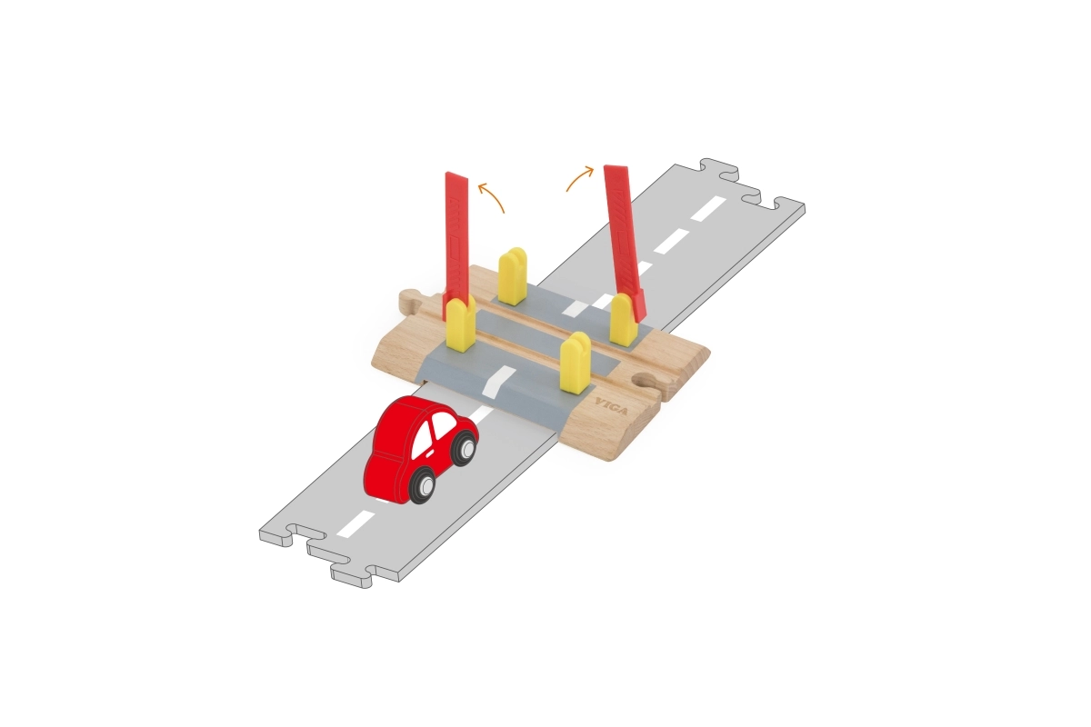 Ambele bariere roșii pot fi ușor ridicate și coborâte – copiii își exersează motricitatea fină și învață să oprească mașinile și trenulețul în momentul sigur.