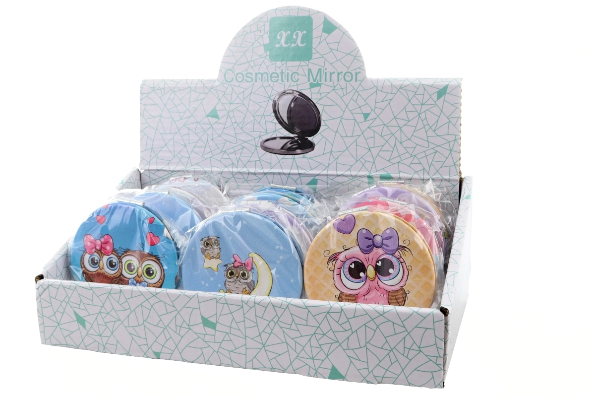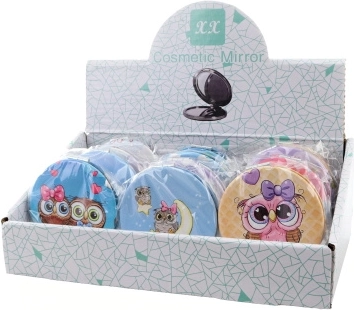 La deschidere vei găsi oglindă dublă – practică pentru retușuri detaliate de machiaj sau o verificare rapidă a coafurii pe parcursul zilei. Oglinzile sunt livrate în diferite modele cu motive de bufnițe; varianta concretă este aleasă în funcție de disponibilitatea în stoc.