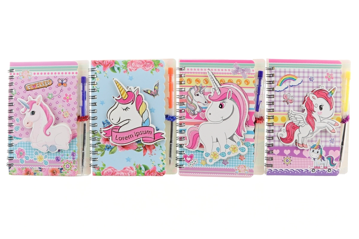 Un caiet vesel cu motiv de unicorni și un pix practic îi va încânta pe micii și marii iubitori ai accesoriilor drăguțe. Oferă 30 de file liniate colorate, dimensiuni compacte 10,5 × 14 × 0,5 cm și este ideal pentru geantă, rucsac sau școală. Se livrează în mai multe variante, în funcție de disponibilitatea stocului.