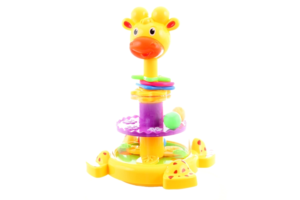 Mecanism intuitiv: prin apăsarea ușoară a capului girafei, biluțele și inelele colorate din camera transparentă se pun în rotație.