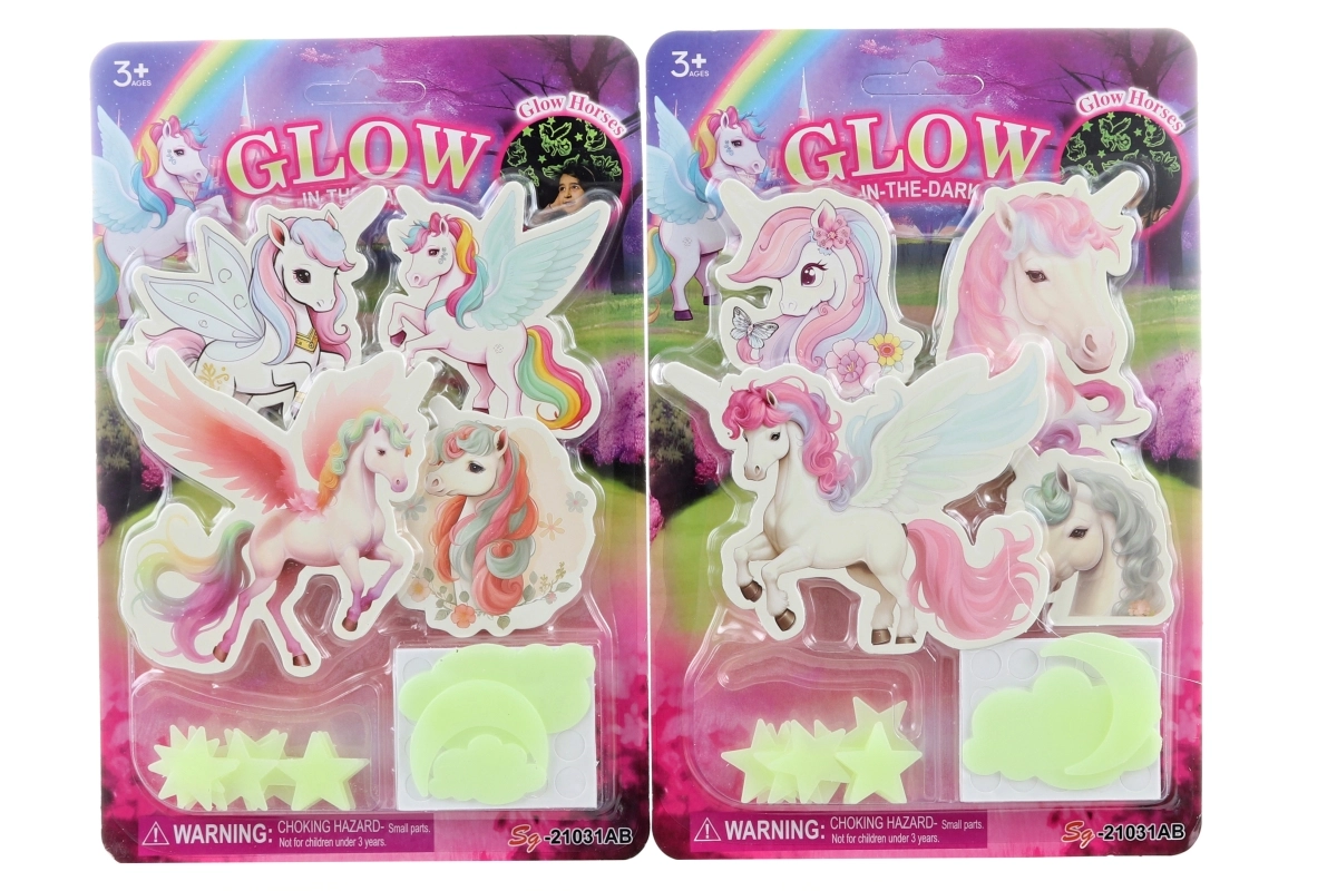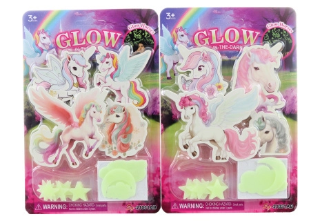 Această set de decorațiuni autoadezive cu motiv de unicorni transformă orice perete într-un cer de basm. După expunere la lumină, elementele emit o strălucire delicată în întuneric și creează un efect luminos liniștitor, îndrăgit de copii.