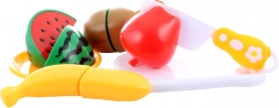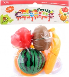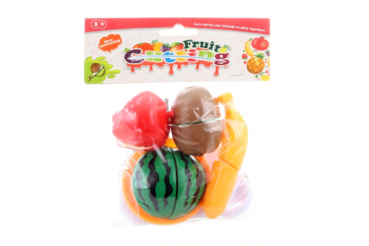Pachetul include patru tipuri de fructe (măr, kiwi, banană, pepene), tocător, cuțitaș și farfuriuță. Material ușor, margini rotunjite sigure și execuție rezistentă fac din acest set un accesoriu perfect pentru bucătăria de jucărie și jocul de-a magazinul.