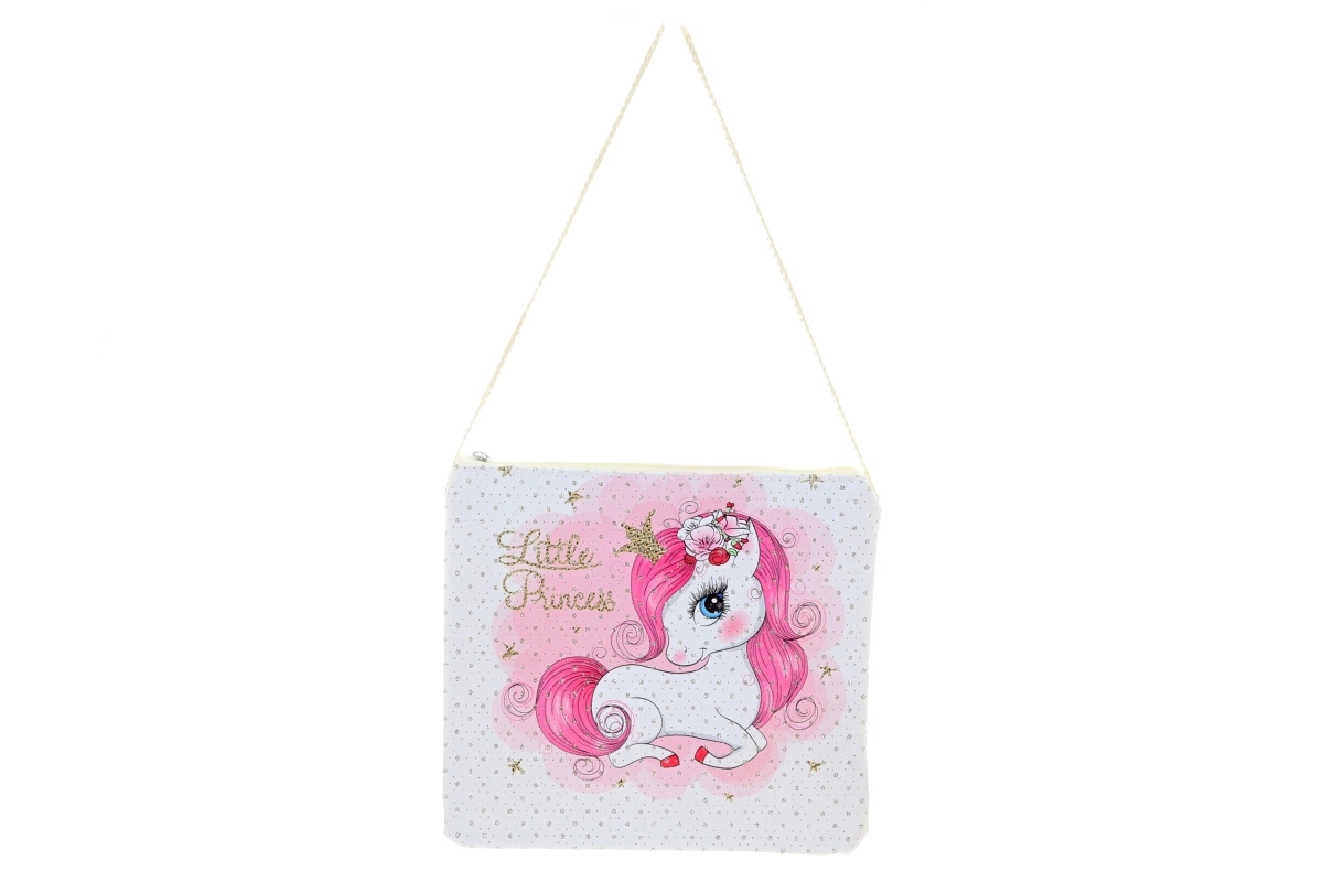 Această geantă decorativă cu motiv de unicorn se remarcă prin imprimeul lucios proeminent pe partea frontală (piele ecologică) și prin materialul textil plăcut. Este ideală ca accesoriu stilat pentru ținute, pentru mărunțișuri sau ca dar pentru iubitorii de unicorni.