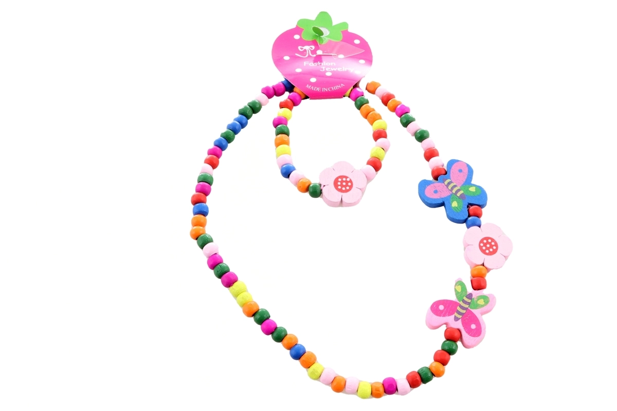 Acest set elegant cu motiv de fluturi va încânta orice mică iubitoare de accesorii. Datorită elasticului, colierul și brățara se pun ușor și stau bine, iar mărgelele din lemn oferă un aspect natural și lejer.