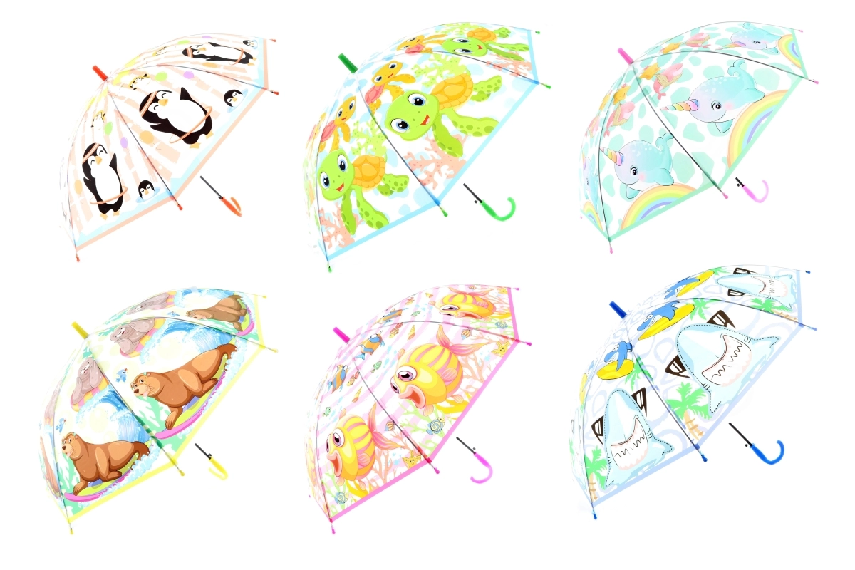 Motive jucăușe cu animale marine și terestre transformă fiecare pas într-o bucurie. Fiecare umbrelă este unică – motivul este livrat în funcție de disponibilitatea în stoc.
