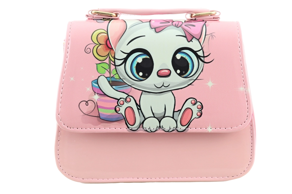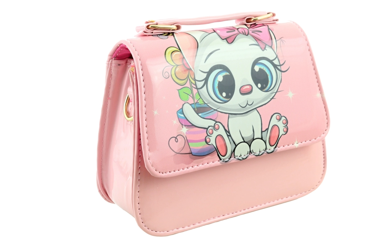 Această geantă roz pentru copii, cu pisicuță, este un accesoriu grozav atât pentru purtare zilnică, cât și pentru momente festive. Finisajul lucios și detaliile delicate creează un aspect fermecător pe care copiii îl vor îndrăgi. Datorită dimensiunilor compacte, se poartă confortabil în mână și încape tot ce este necesar.