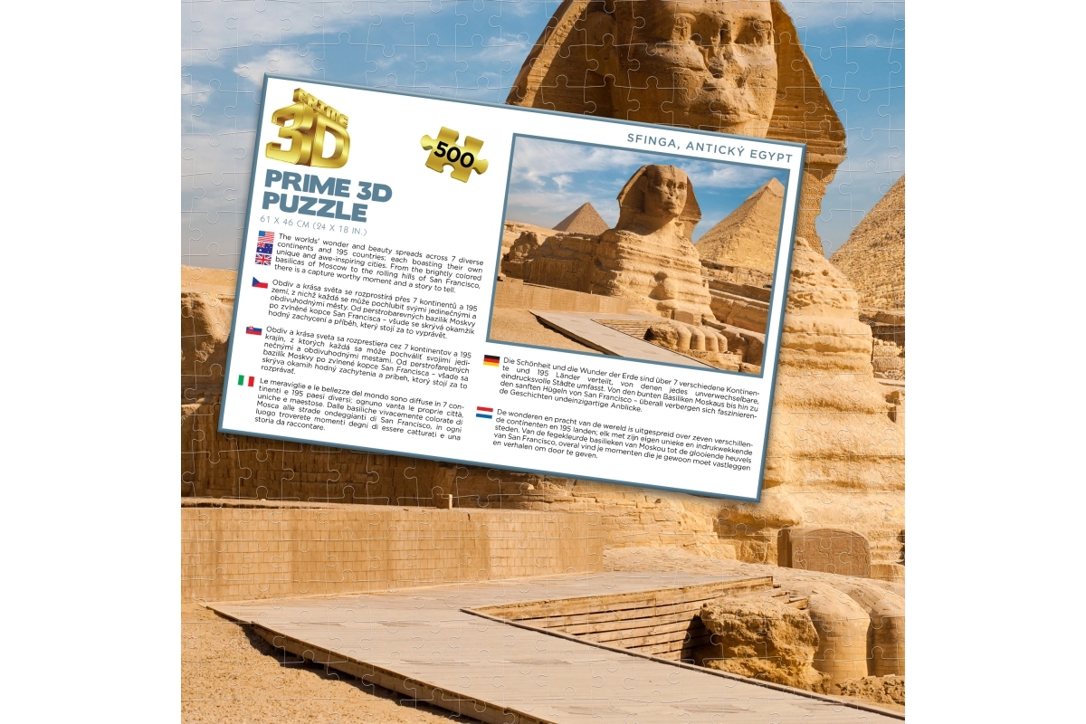 Intră în lumea faraonilor și asamblează legendara Sfinxă chiar la tine acasă. Acest puzzle 3D de calitate îmbină distracția, învățarea și dezvoltarea motricității fine. Datorită celor 500 de piese solide, este ideal atât pentru copii, cât și pentru adulți care iubesc provocările și temele istorice.