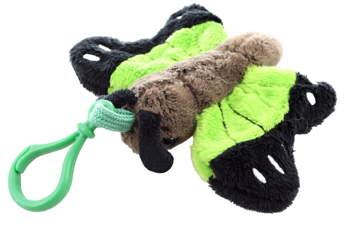 Acest fluture de pluș în rol de breloc îmbină designul adorabil cu utilitatea practică. Datorită materialului de pluș moale se ține plăcut în mână, iar clema/inelul verde permite prinderea ușoară pe rucsac, geantă sau chei. Fiecare fluturaș are detalii fine ale aripilor și un trupușor foarte pufos pentru un plus de drăgălășenie.