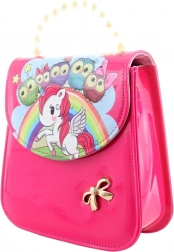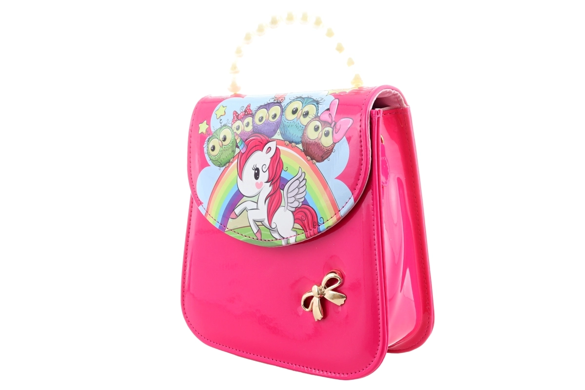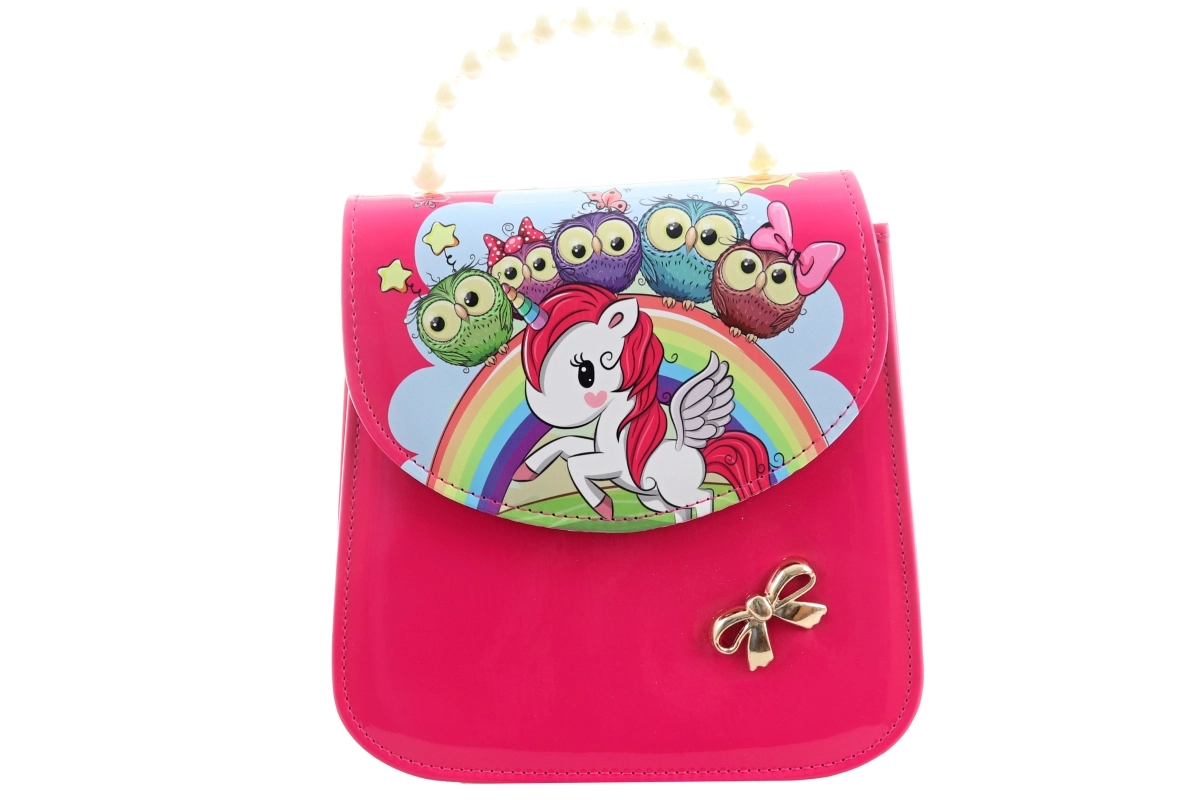 Această geantă roz stilată, cu imprimeu colorat cu unicorn, curcubeu, steluțe și bufnițe, este creată pentru copiii care iubesc designul jucăuș și își doresc să aibă comorile la îndemână. Suprafața lucioasă se întreține ușor și arată elegant.