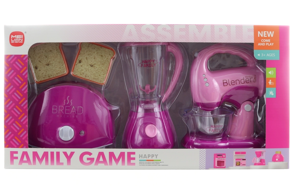 Acest set colorat de aparate casnice le oferă copiilor o experiență autentică a gătitului. Prăjitorul, după pornire, luminează, scoate sunete și, după o clipă, ejectează feliile. Mixerul are recipient transparent, luminează și se rotește, la fel ca telul electric, care, în plus, pune paletele în mișcare în mod realist. Totul este adaptat pentru joaca sigură a copiilor.