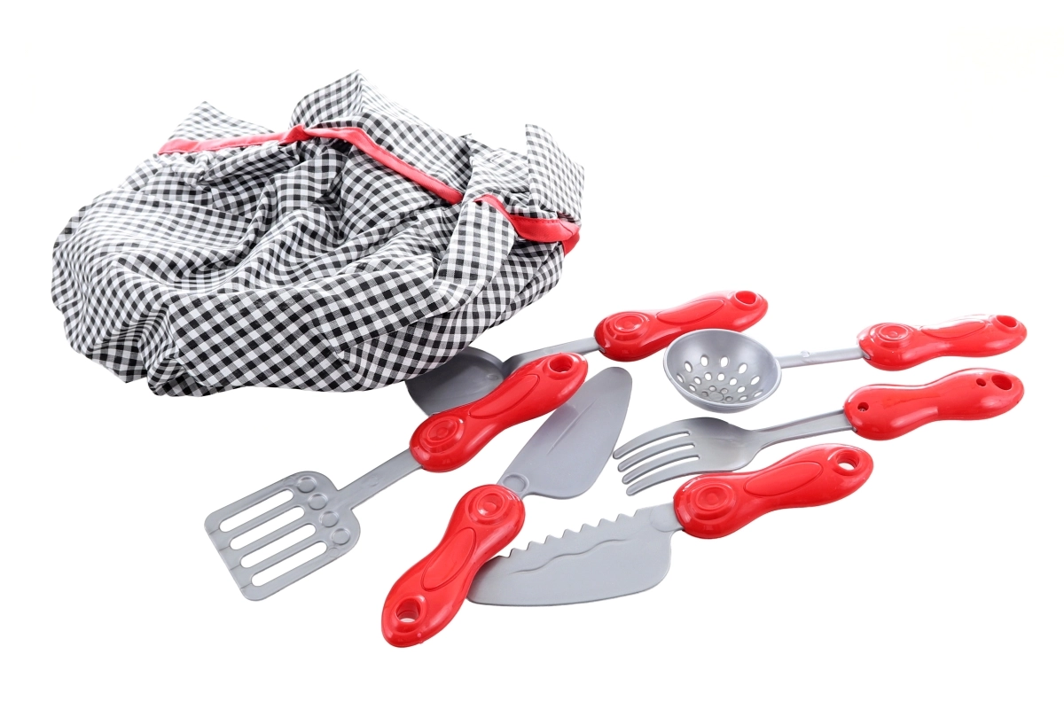 Accesorii de bucătărie din plastic, cu mânere ergonomice, concepute pentru mâini mici și joacă în siguranță.