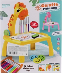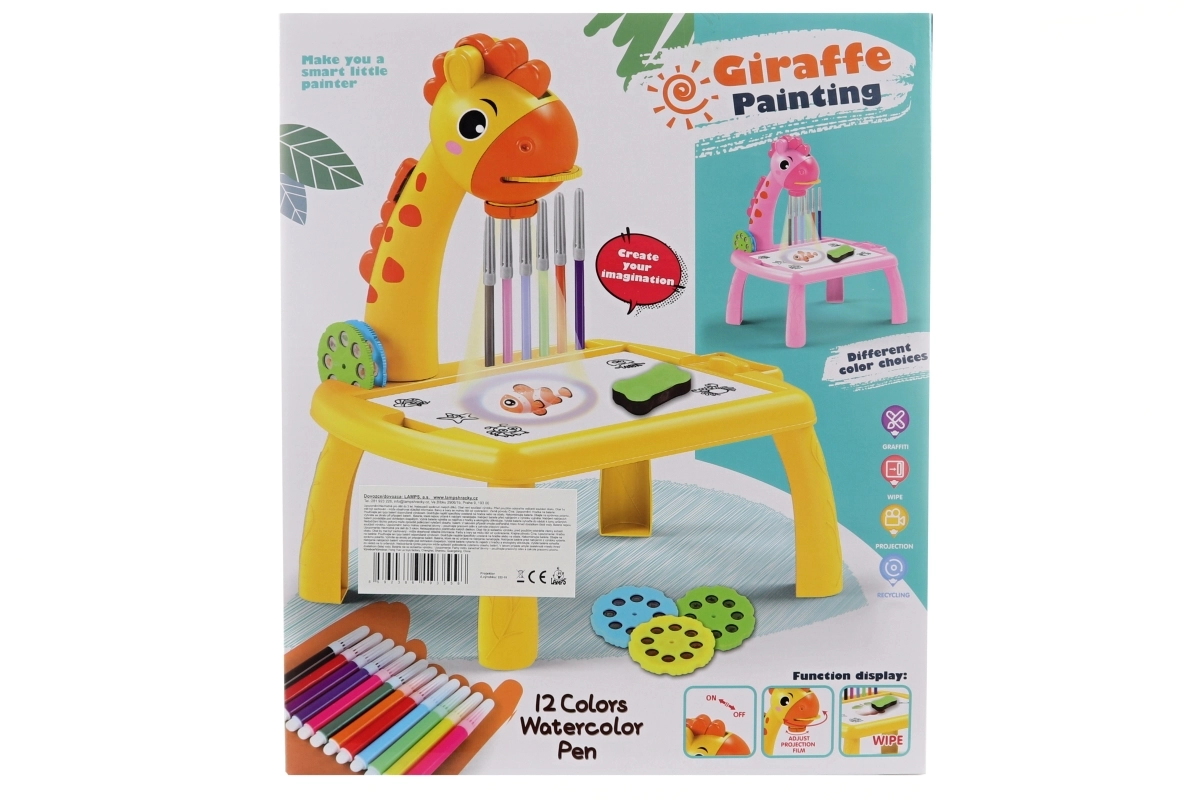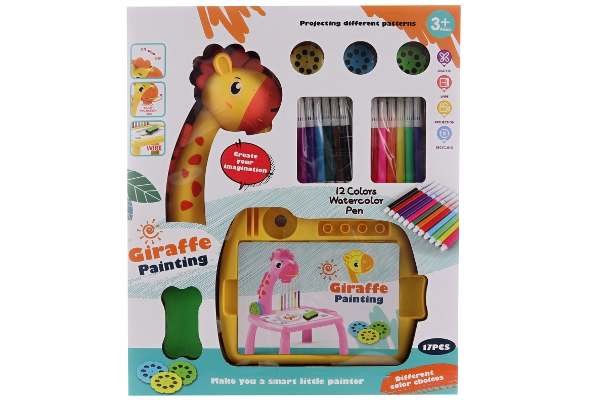 Un proiector distractiv pentru copii în formă de girafă proiectează imagini și dezvoltă creativitatea. Setul include 12 carioci colorate, un burete și 3 discuri cu imagini. Alimentare cu 3× baterii AAA (nu sunt incluse). Ideal pentru copii de la 3 ani.