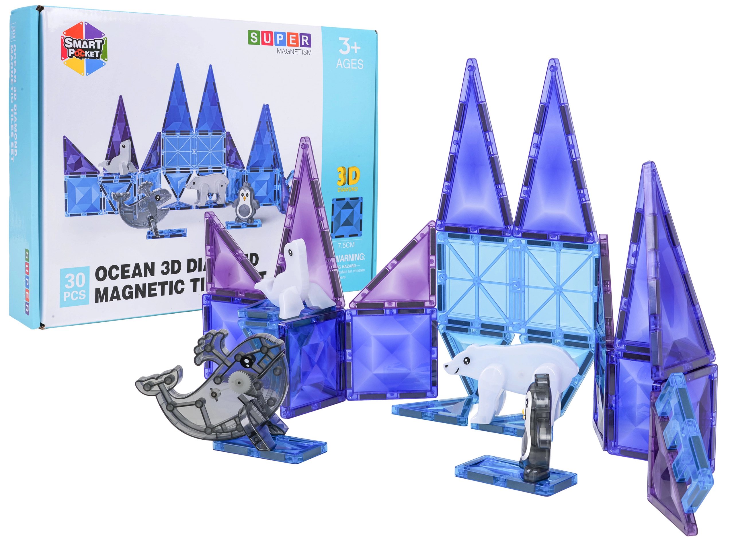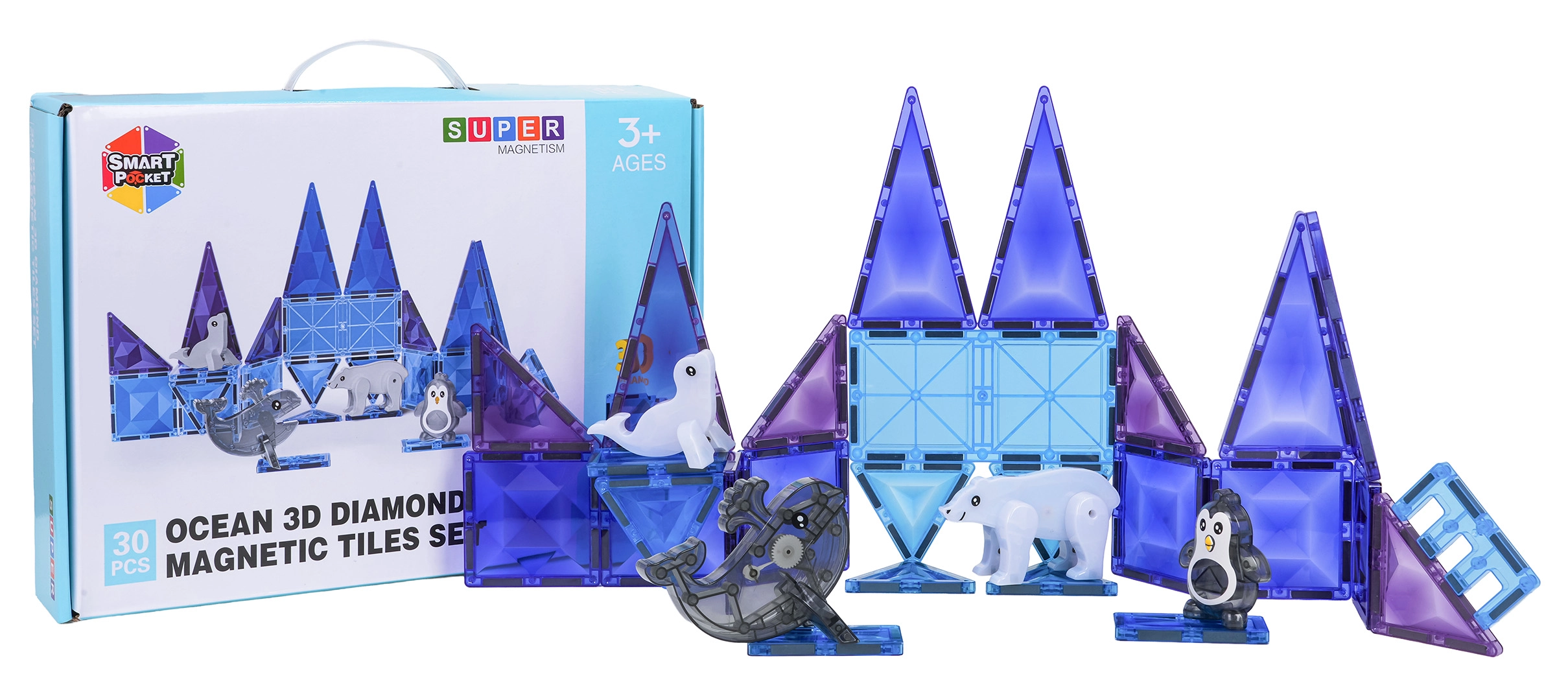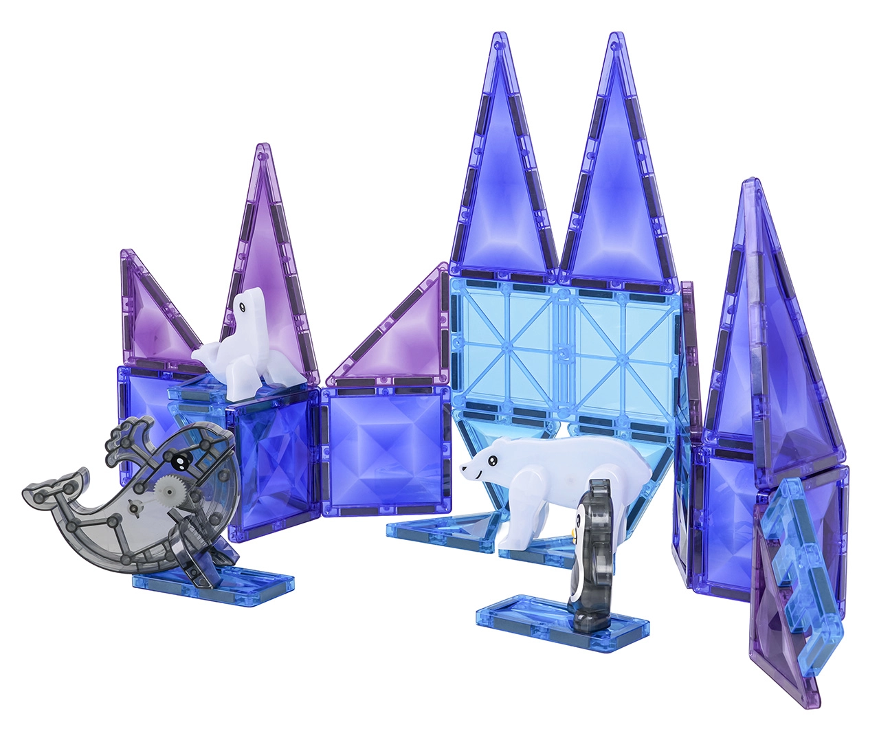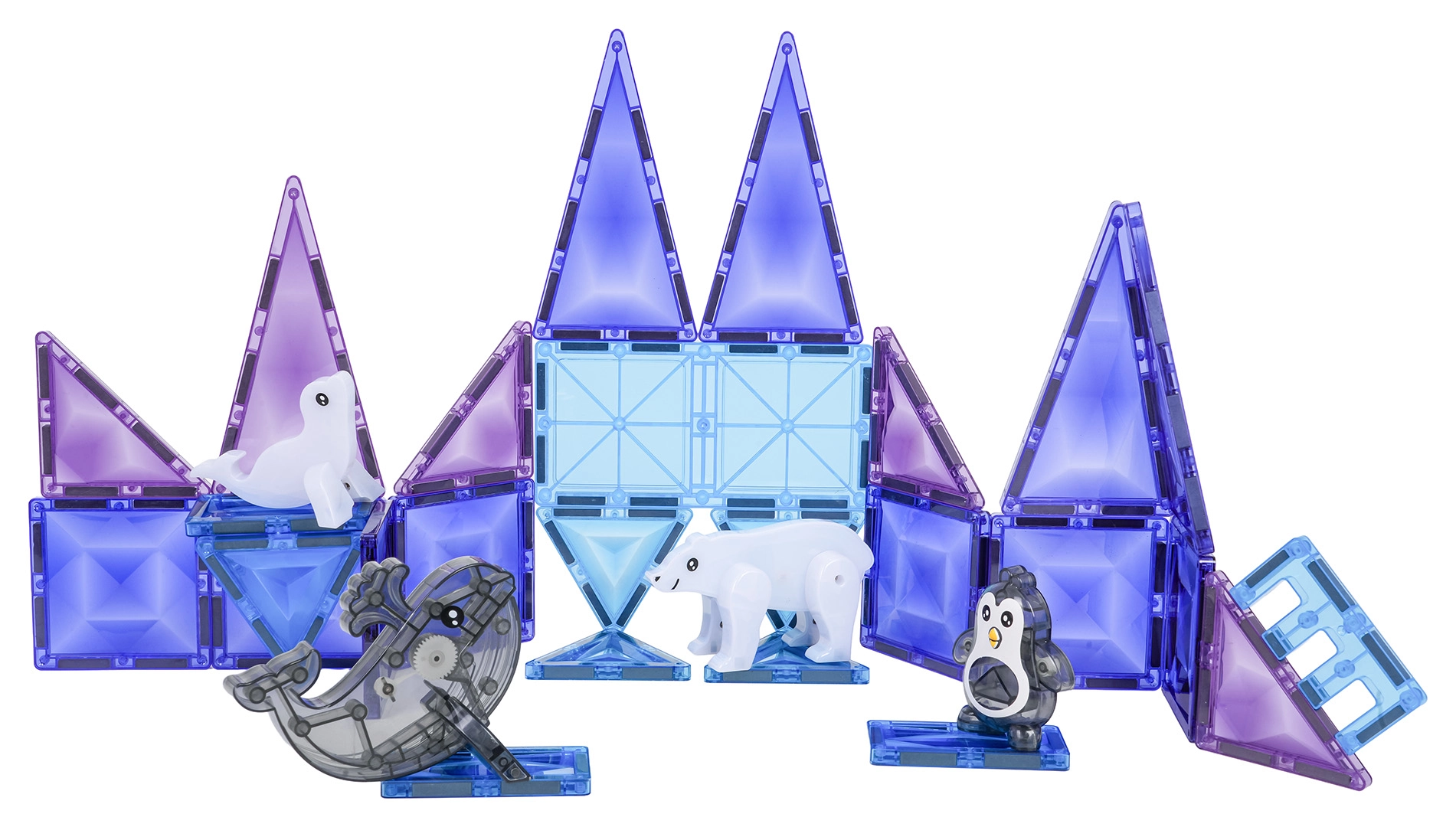 Setul de construcție magnetic Ice Snow este conceput pentru copii de la 3 ani. Piesele semitransparente în culori reci se asamblează în turnuri, ziduri și palate de gheață, iar îmbinările magnetice mențin forma pentru construcții stabile. Sunt incluse și figurine drăgălașe – focă, pinguin, delfin și urs polar – care dau viață fiecărui joc.