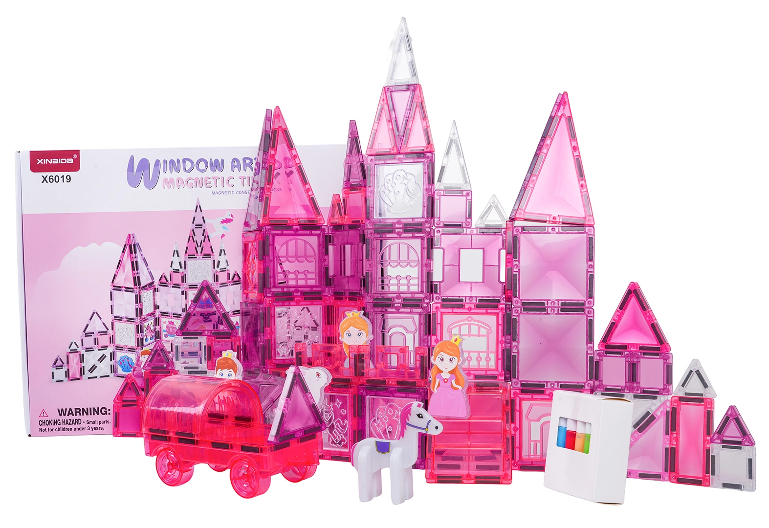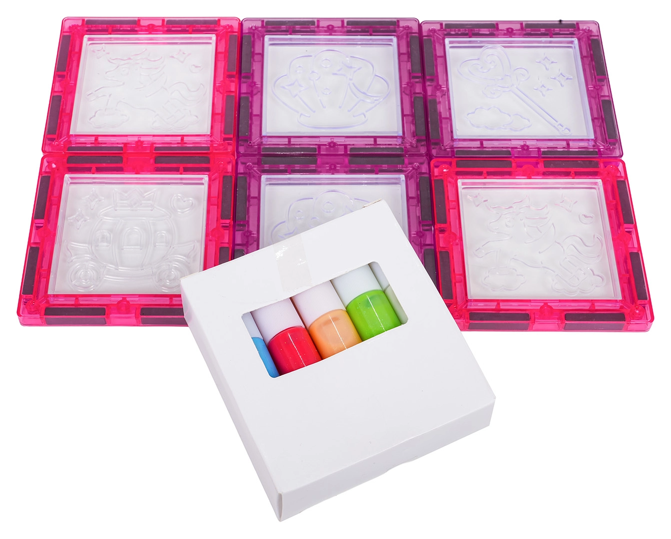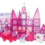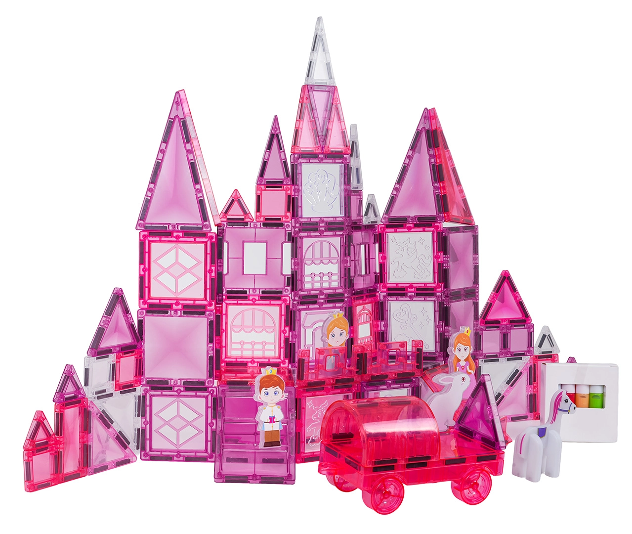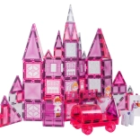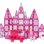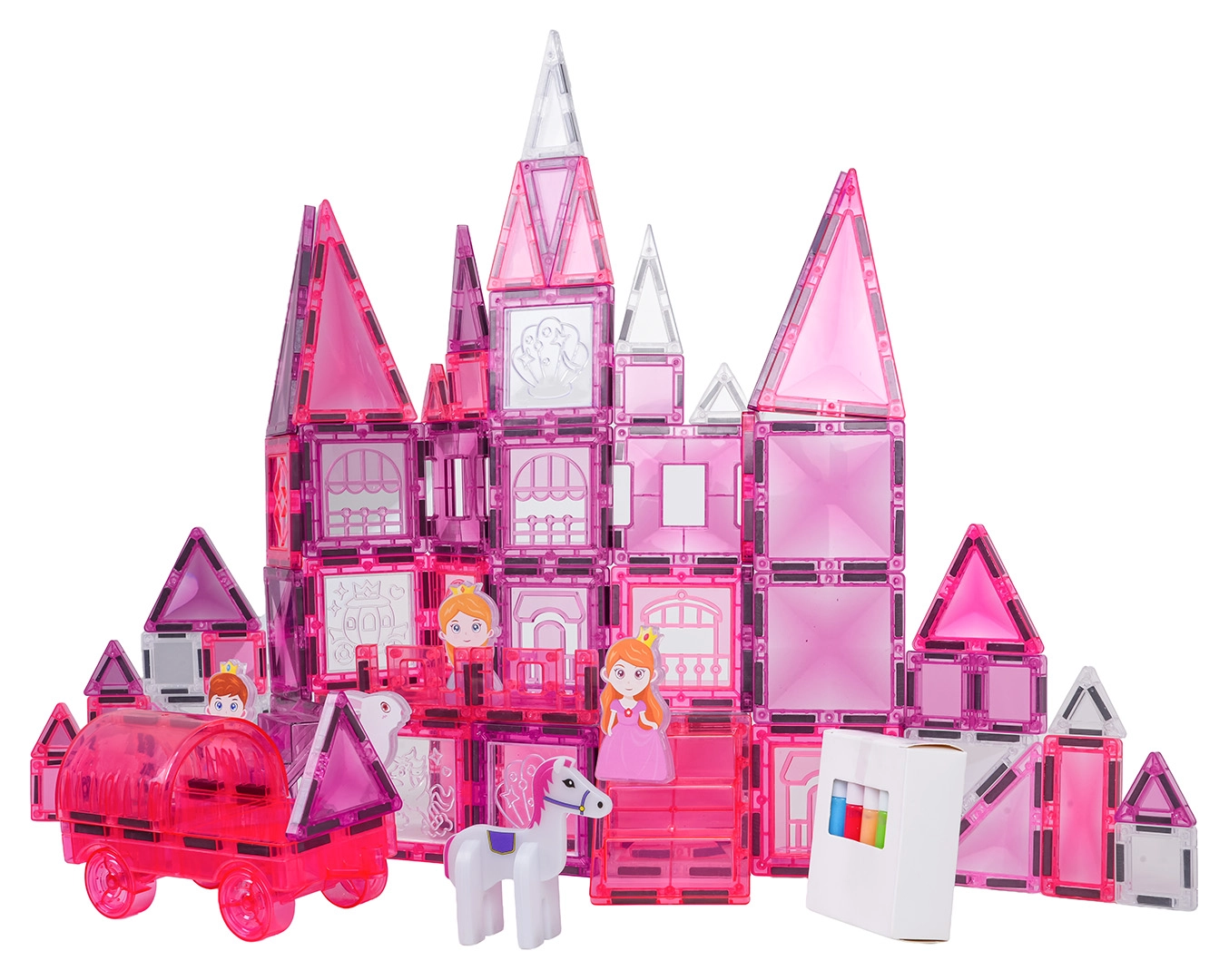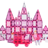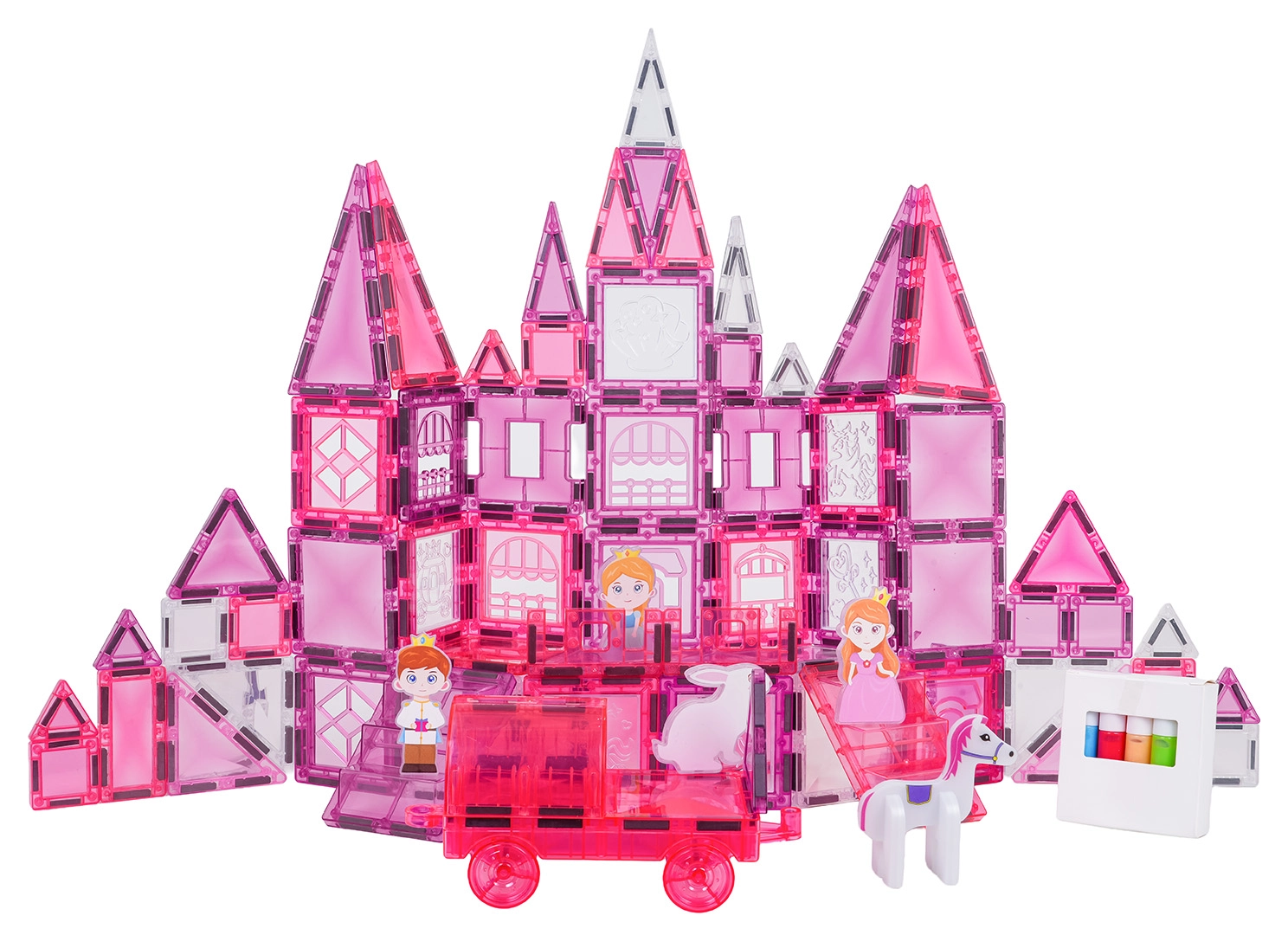 Set magic de construcție magnetică pentru micii creatori de la 3 ani permite construirea de castele roz, trăsuri și scene întregi cu personaje. Setul conține 126 de piese, inclusiv plăcuțe magnetice translucide, șasiu cu roți, figurine și piese pentru colorat cu markere gel incluse. Magneții puternici din neodim asigură îmbinări ferme și construcții stabile care dezvoltă creativitatea, răbdarea și concentrarea.