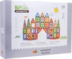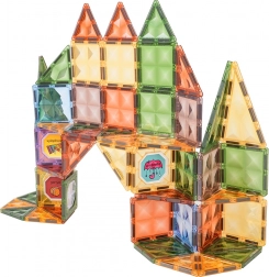 Acest set de construcție magnetică, bogat dotat, oferă pătrate și triunghiuri colorate și transparente, care se conectează sigur pe margini. Copiii pot crea castele, arcade și structuri geometrice, antrenând totodată motricitatea fină și concentrarea. Piesele sunt din plastic de calitate, rezistent, iar magneții asigură o îmbinare fermă la diferite unghiuri.