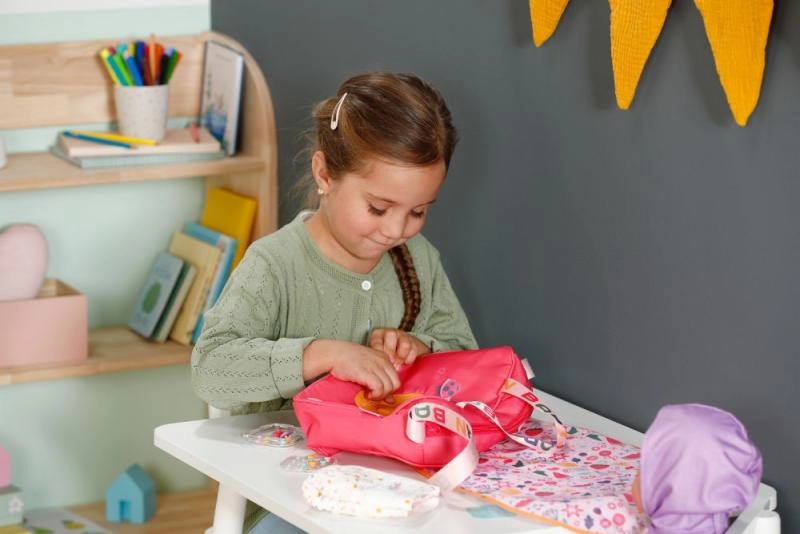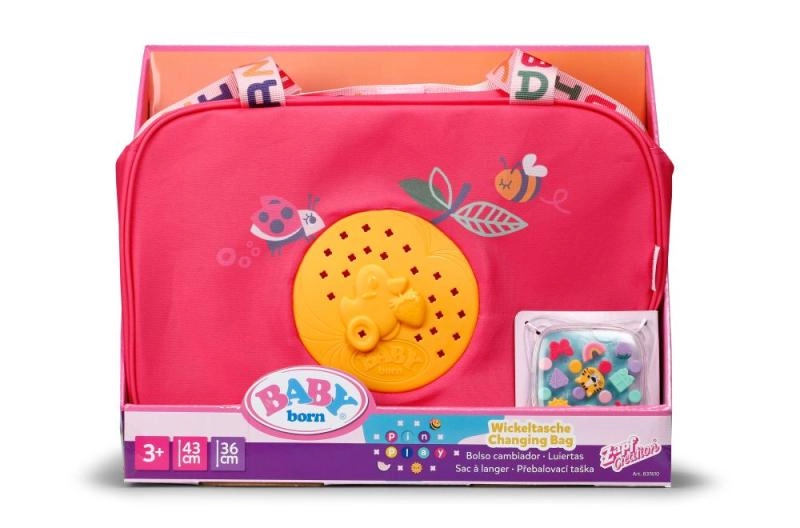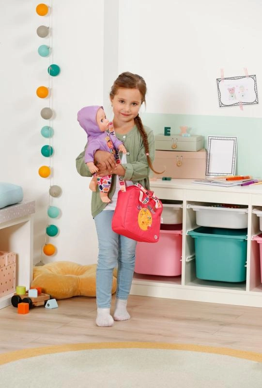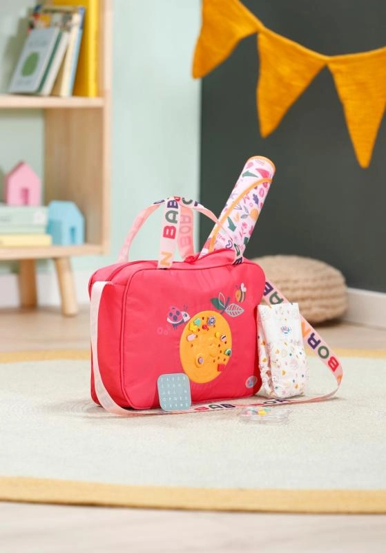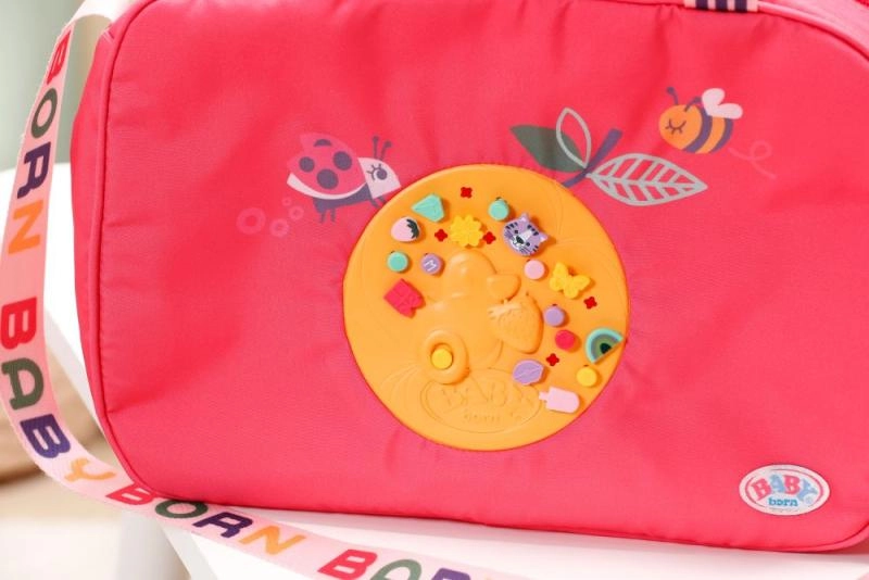 Geanta de schimbat scutece BABY born este ușoară, rezistentă și concepută pentru a păstra la îndemână toate lucrurile esențiale pentru îngrijirea păpușii. Are fermoar, buzunare practice și o curea de umăr confortabilă. Motivele colorate și detaliile jucăușe transformă fiecare plimbare într-o aventură stilată.