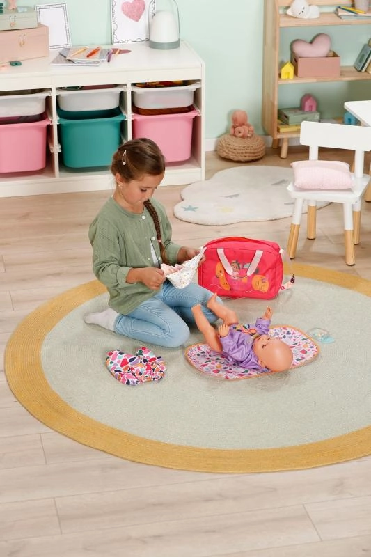 Datorită decorațiunilor cu capse, copiii își pot personaliza geanta după bunul plac – susținând astfel creativitatea, motricitatea fină și grija față de ceilalți. Setul include o saltea pliabilă pentru înfășat, pentru schimbare comodă oriunde, un scutec și accesorii mici precum un recipient pentru pudră și o cutie pentru lucrurile esențiale.