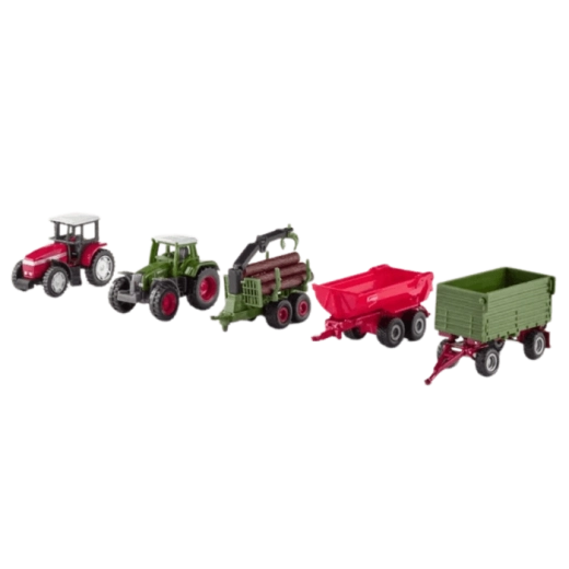 Acest set versatil Siku Farmer oferă o experiență autentică din lumea tehnicii agricole. Include tractorul MASSEY FERGUSON 9240, tractorul FENDT FAVORIT 926, o remorcă forestieră cu macara de încărcare pivotantă și oscilantă, basculantă roșie KRAMPE și o remorcă cu două axe. Execuția precisă și detaliile funcționale susțin jocul creativ și dezvoltarea motricității.