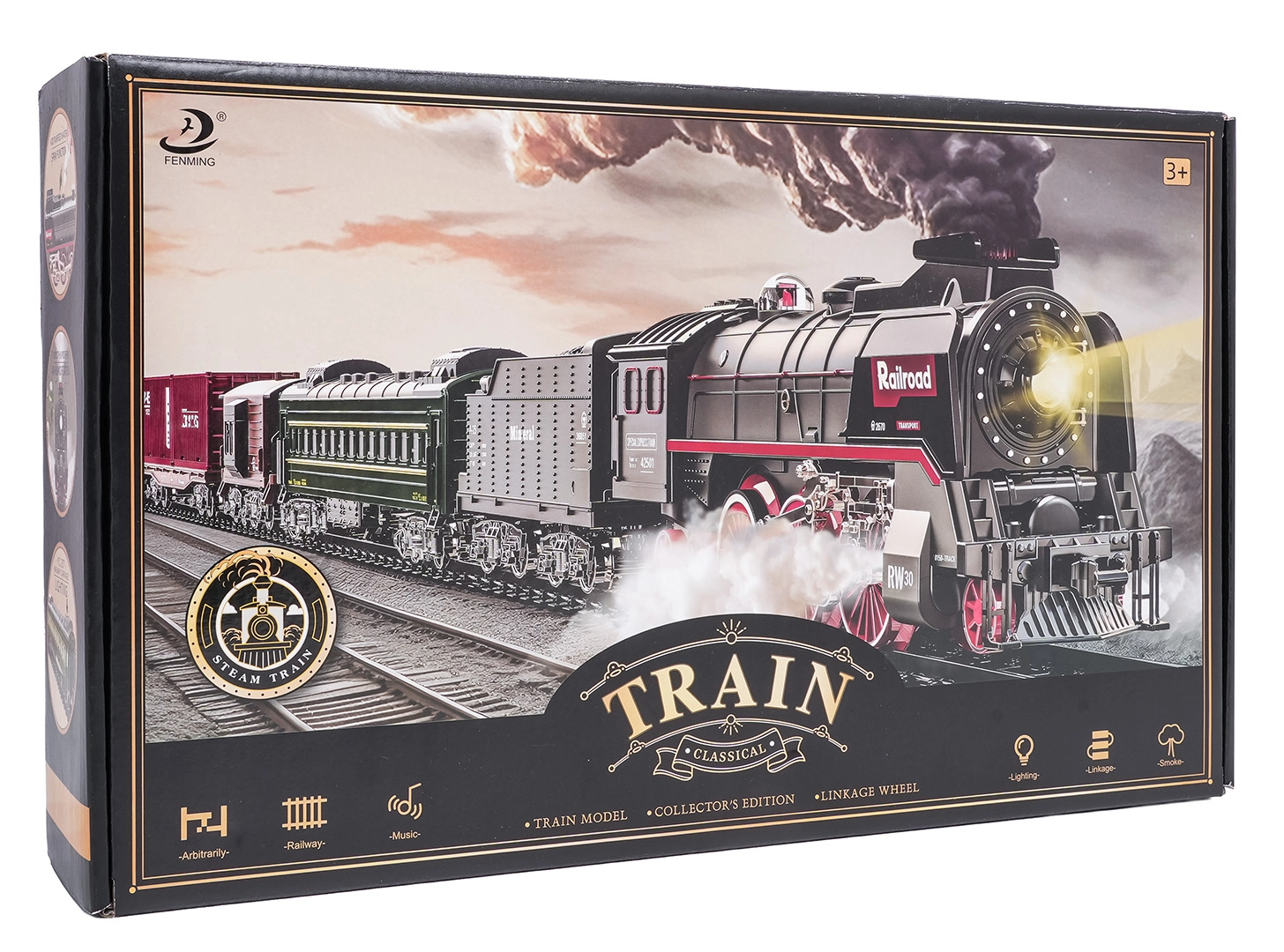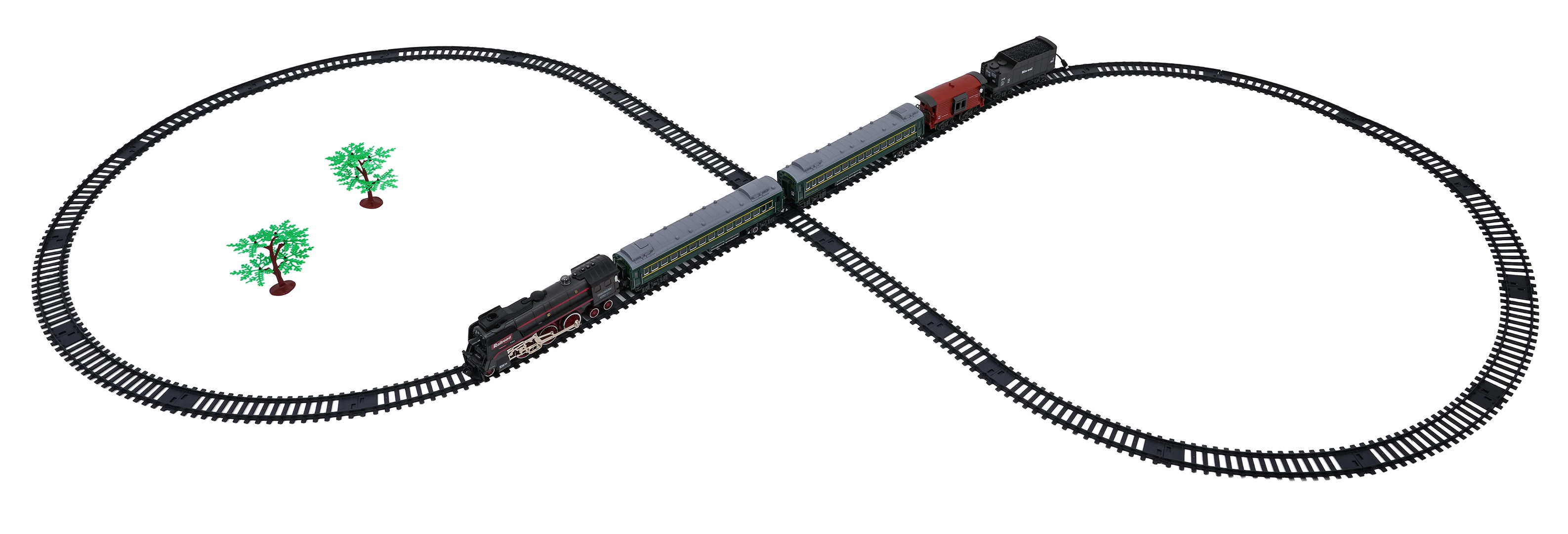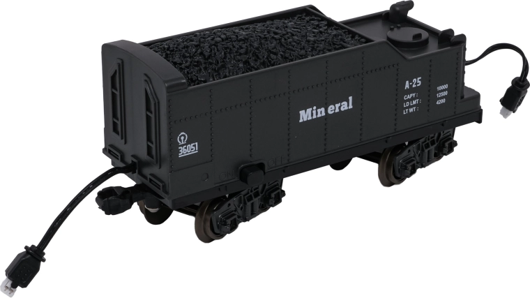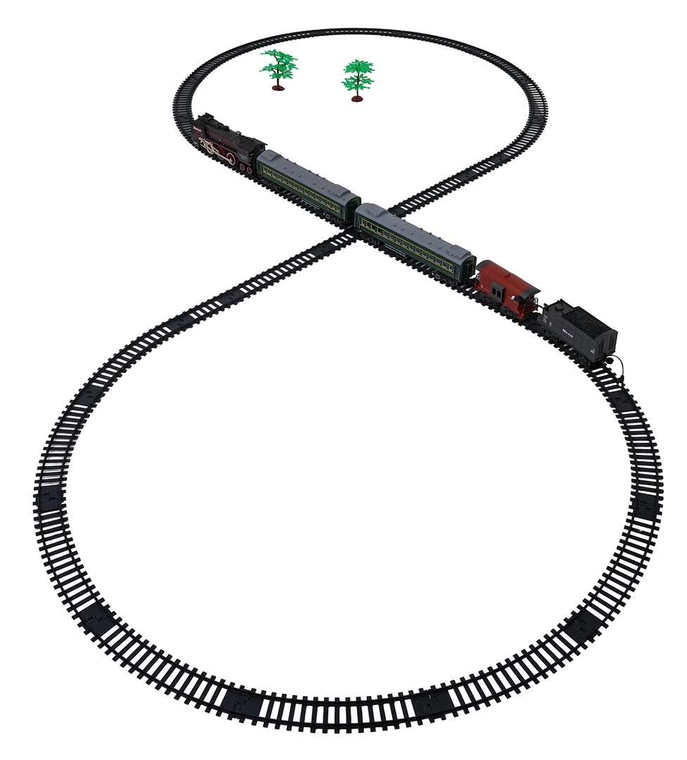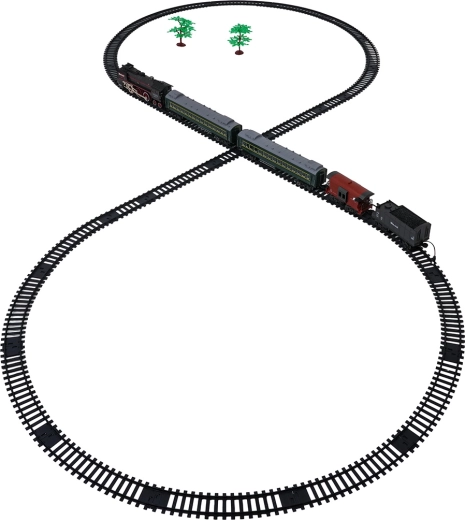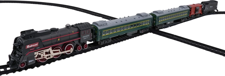 Setul include locomotiva, 2 vagoane de călători, vagon cu cărbune și vagon de marfă/animale, care împreună formează o garnitură impresionantă. Șinele din plastic durabil se asamblează rapid într-un circuit mare de aproximativ 216 × 92,5 cm. Pentru un joc mai liniștit, sunetele locomotivei pot fi oprite.