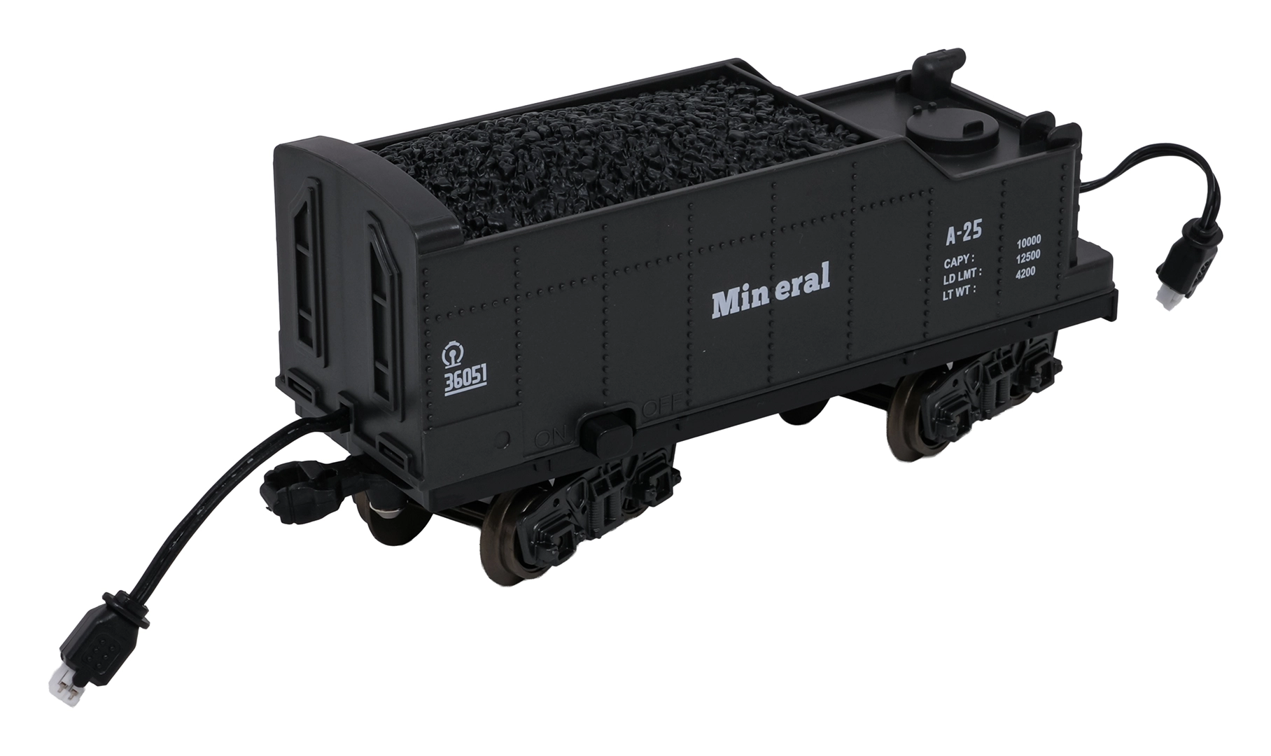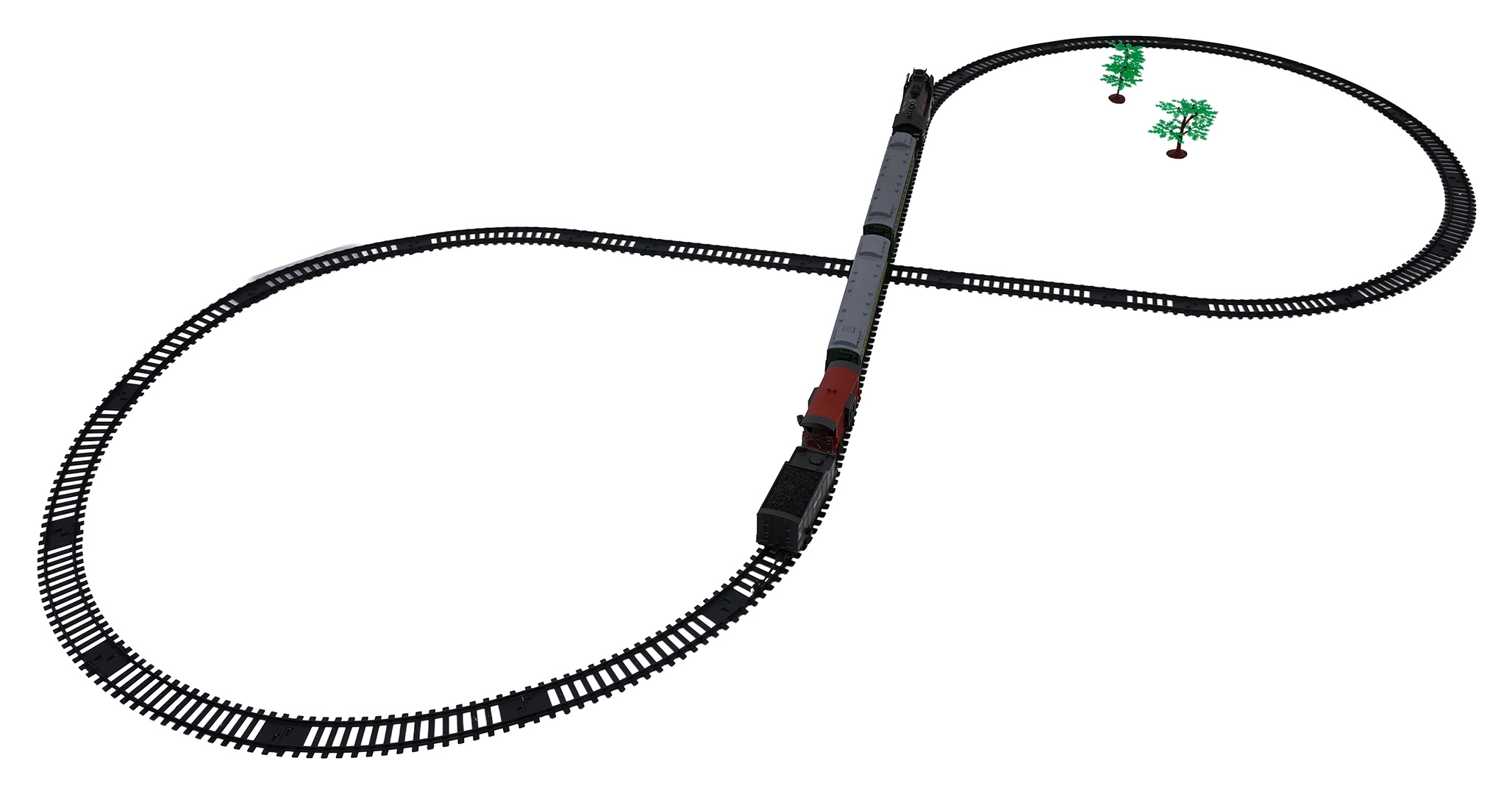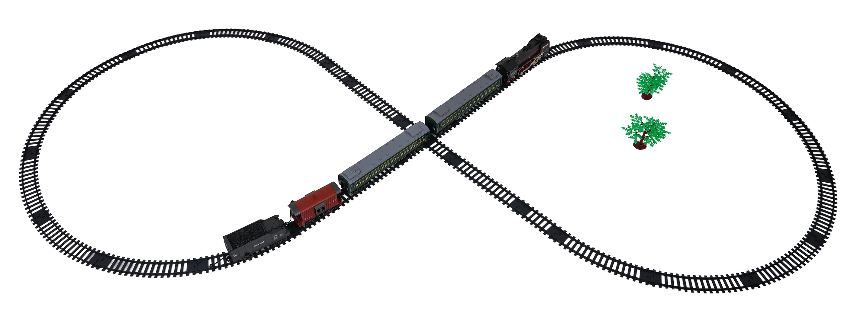 Setul include locomotiva, 2 vagoane de călători, vagon cu cărbune și vagon de marfă/animale, care împreună formează o garnitură impresionantă. Șinele din plastic durabil se asamblează rapid într-un circuit mare de aproximativ 216 × 92,5 cm. Pentru un joc mai liniștit, sunetele locomotivei pot fi oprite.