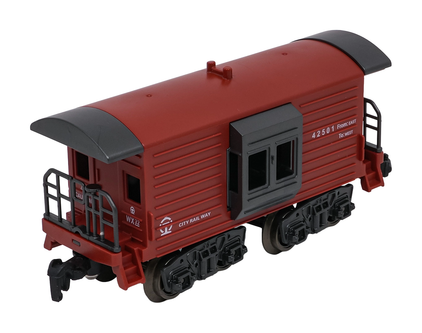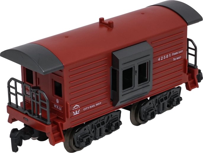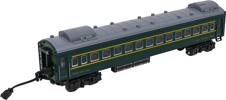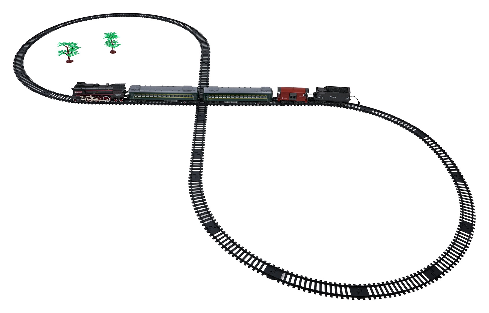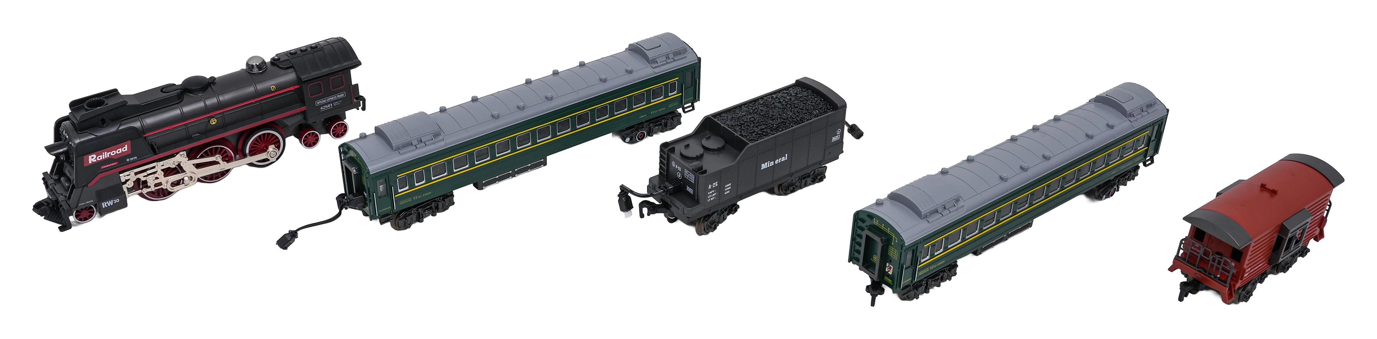 Sunt incluse locomotiva, tenderul cu cărbune, două vagoane verzi de călători și un vagon roșu de marfă. Fiecare piesă are cuple funcționale și detalii realiste pentru un joc captivant.
