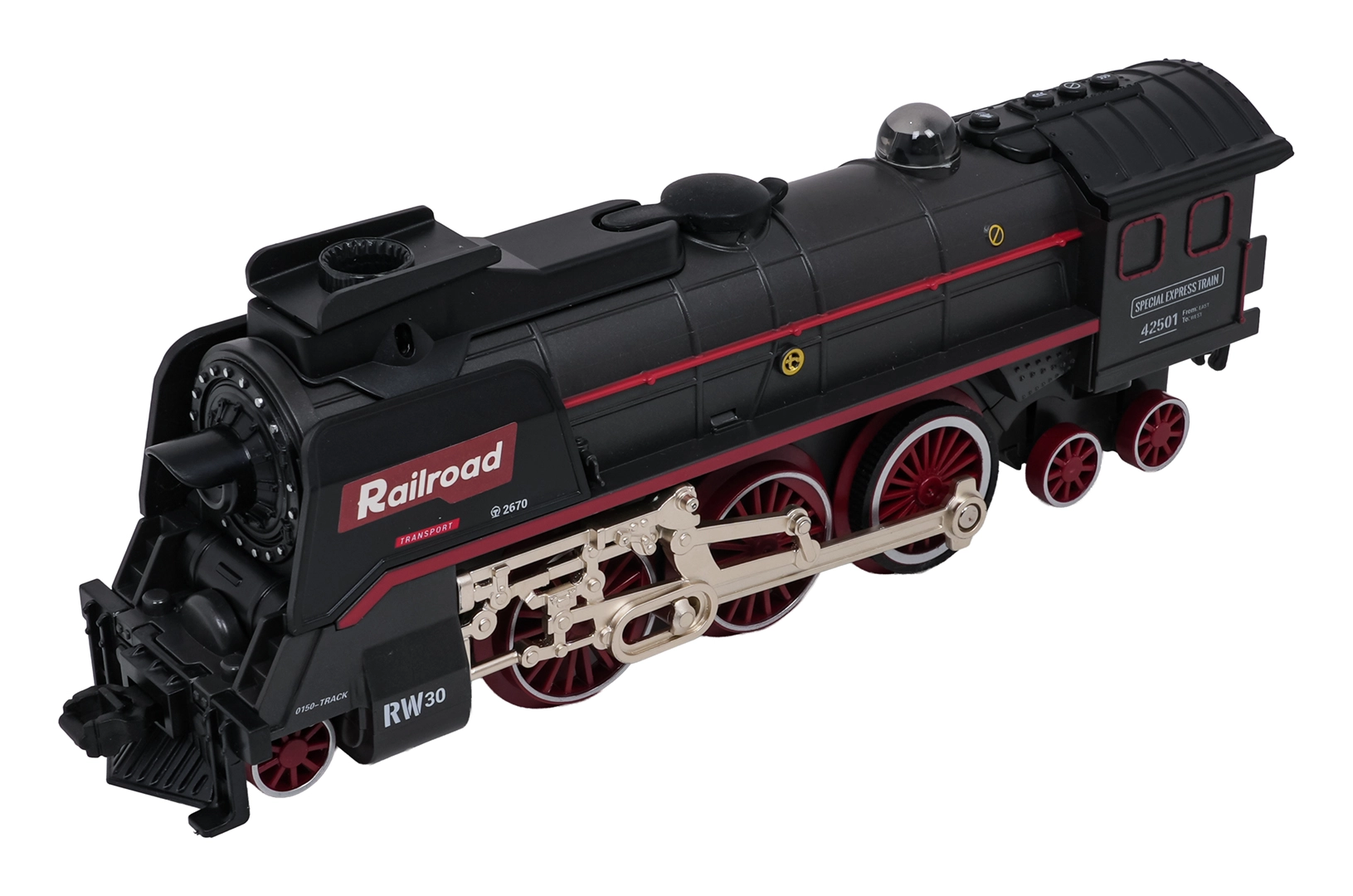Locomotiva, în timpul mersului, eliberează fum din coș și din laterale, luminează cu farul frontal și este însoțită de sunete autentice. Fumul se activează prin adăugarea de apă cu pipeta inclusă.