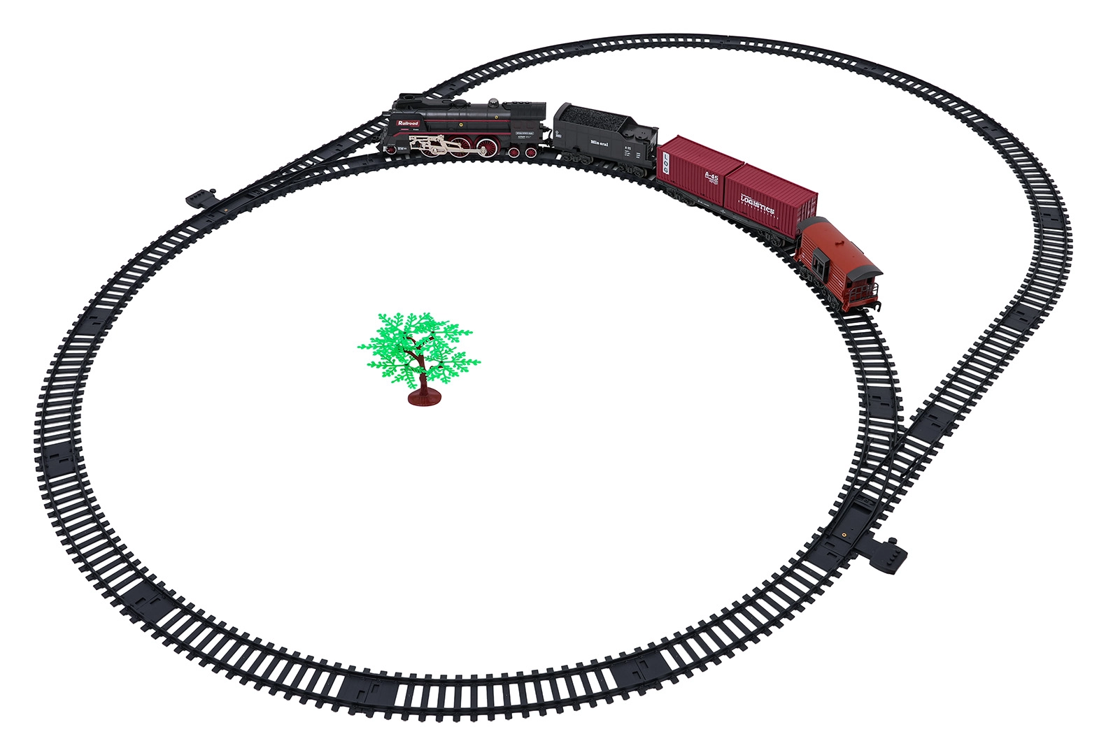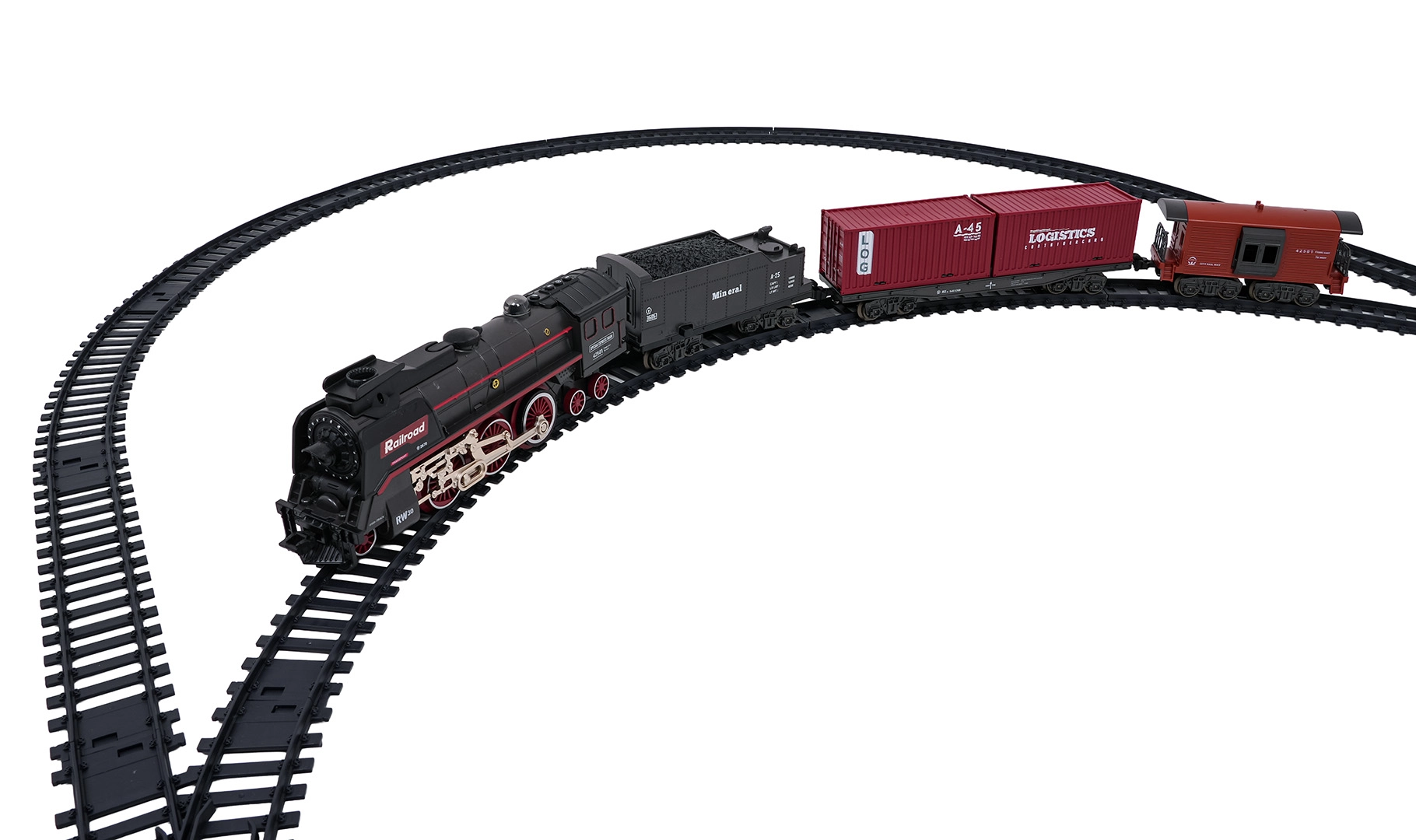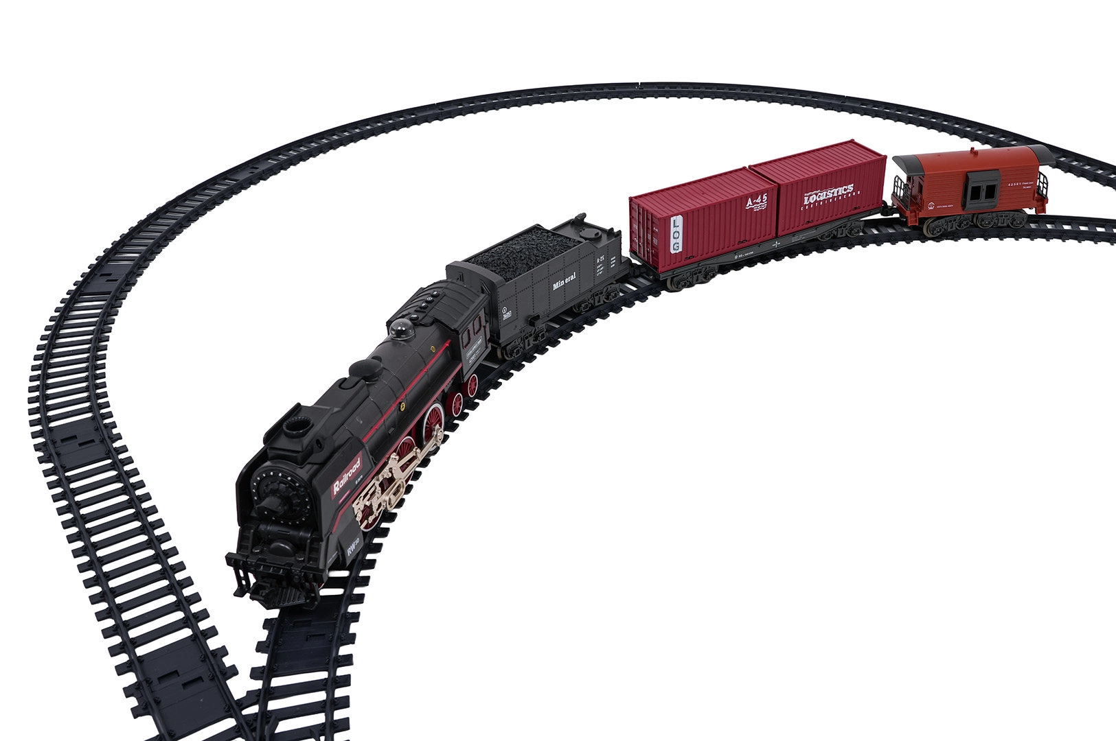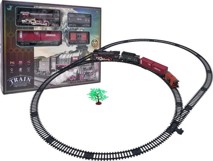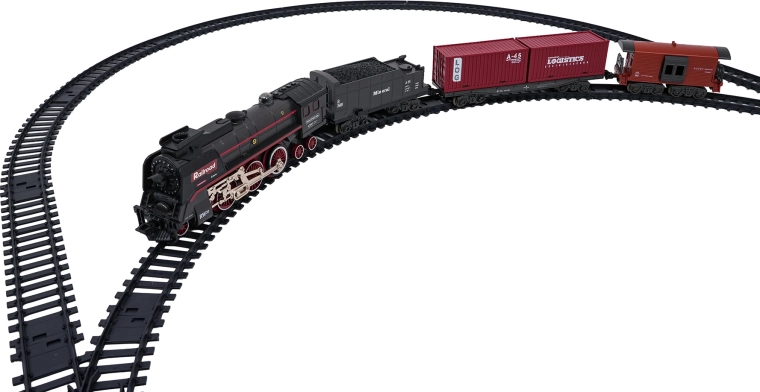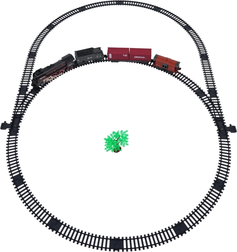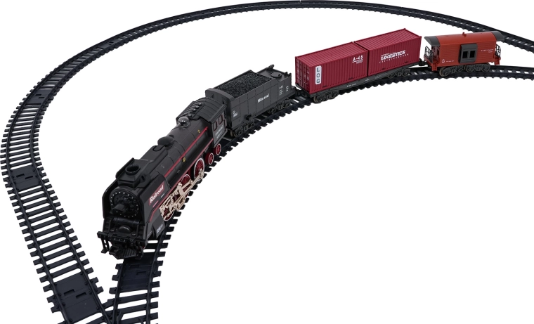 Șinele sunt rezistente, sigure și se conectează ușor într-o rută de aproximativ 138 × 99 cm. Setul include vagon de pasageri, tender cu cărbune și vagon container pentru scenarii variate de joacă. Pentru un mod mai liniștit, sunetele pot fi dezactivate, iar locomotiva poate merge înainte, înapoi și se poate opri.