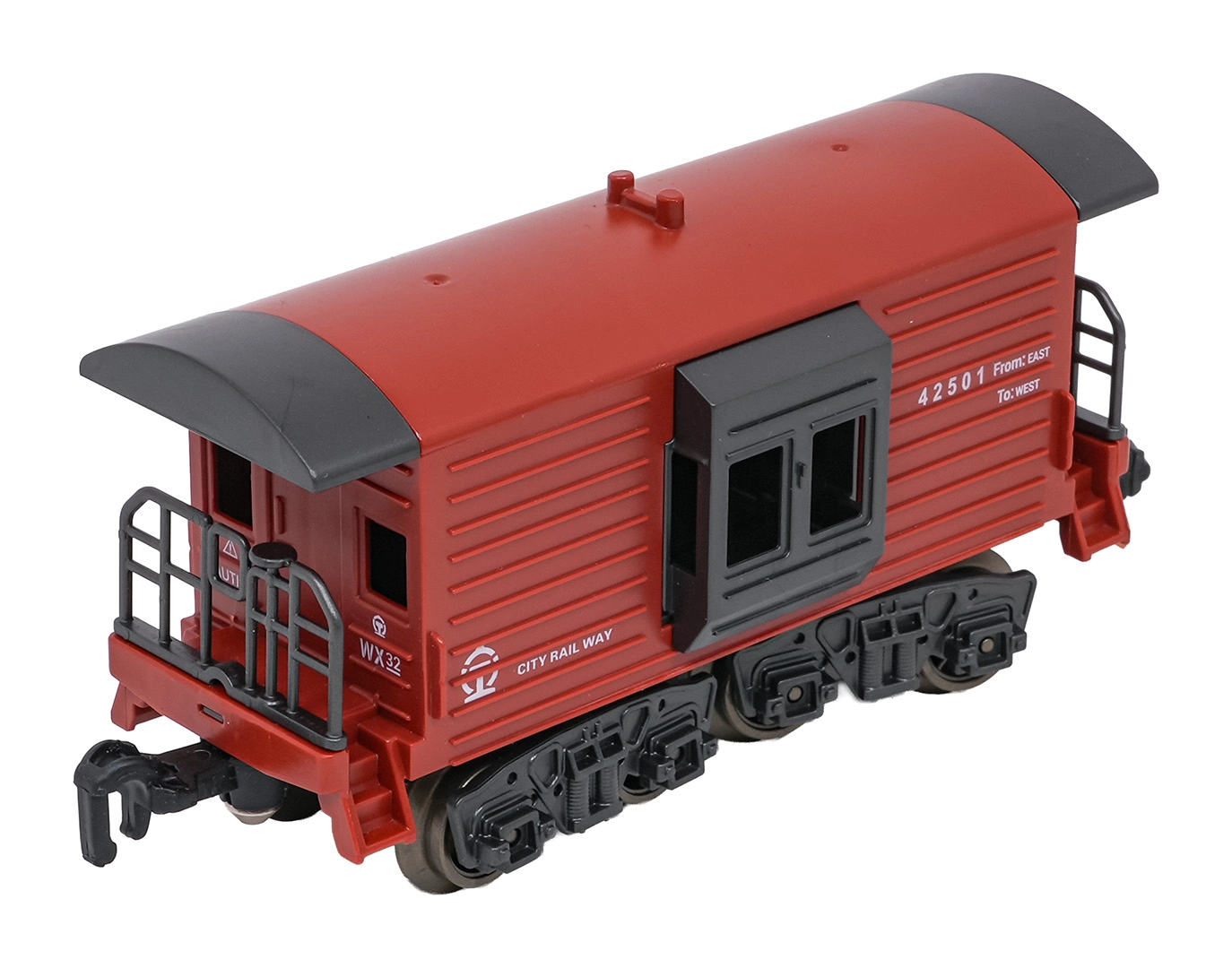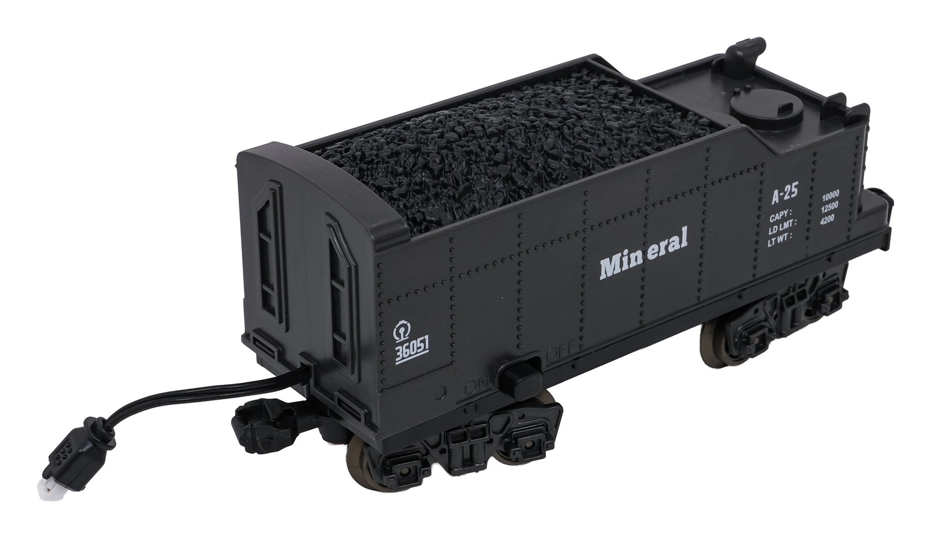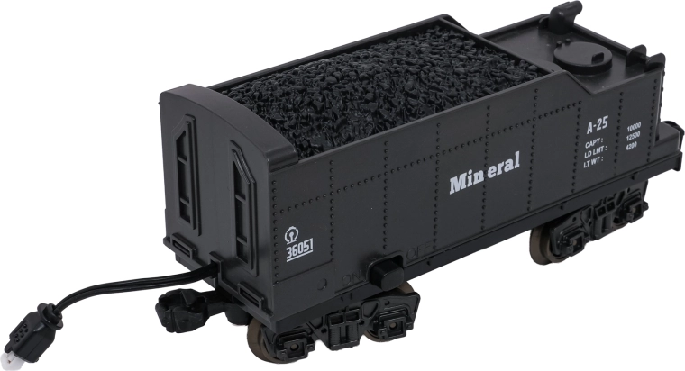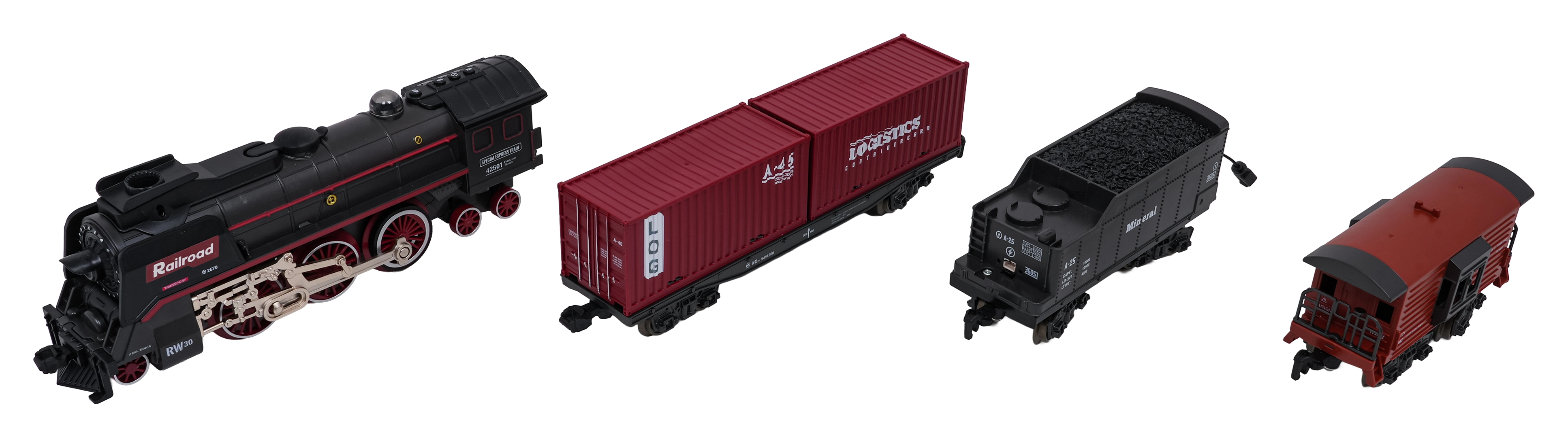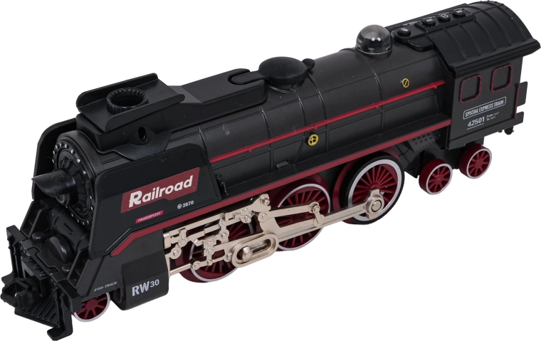 Șinele sunt rezistente, sigure și se conectează ușor într-o rută de aproximativ 138 × 99 cm. Setul include vagon de pasageri, tender cu cărbune și vagon container pentru scenarii variate de joacă. Pentru un mod mai liniștit, sunetele pot fi dezactivate, iar locomotiva poate merge înainte, înapoi și se poate opri.