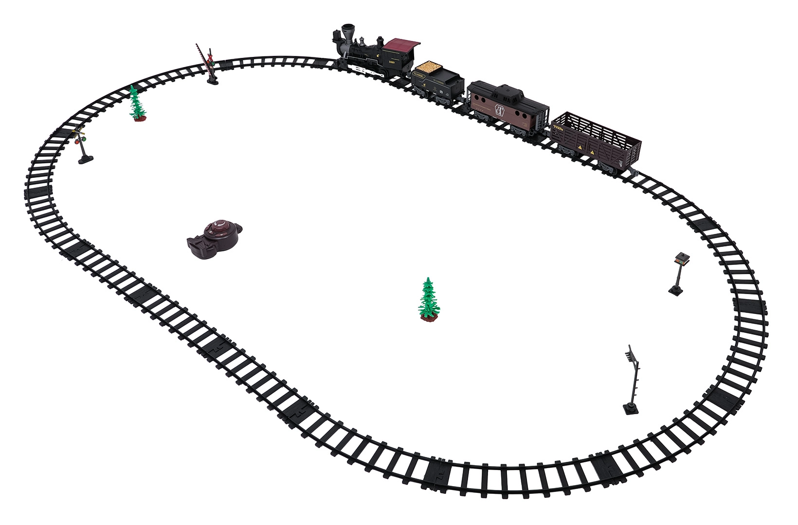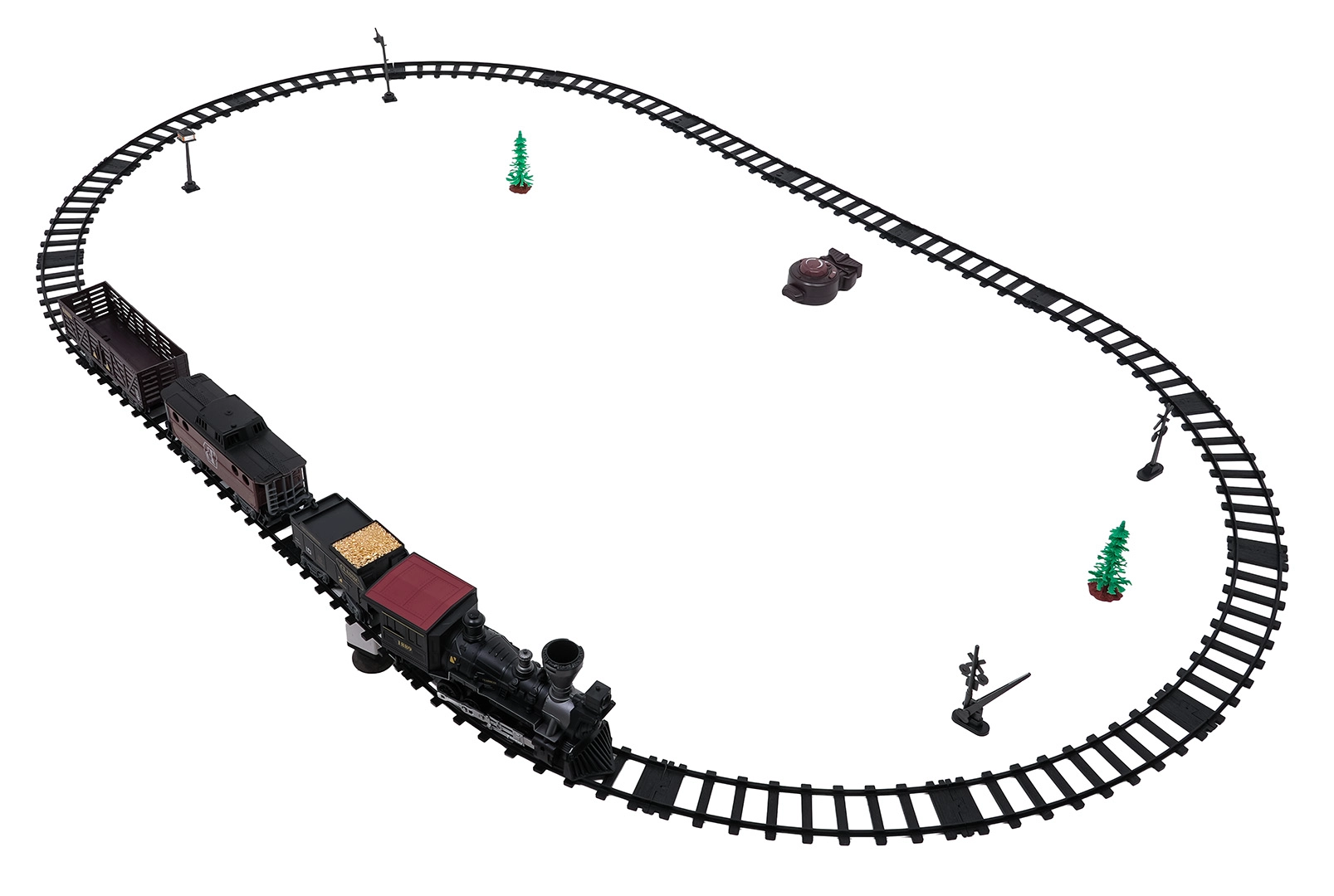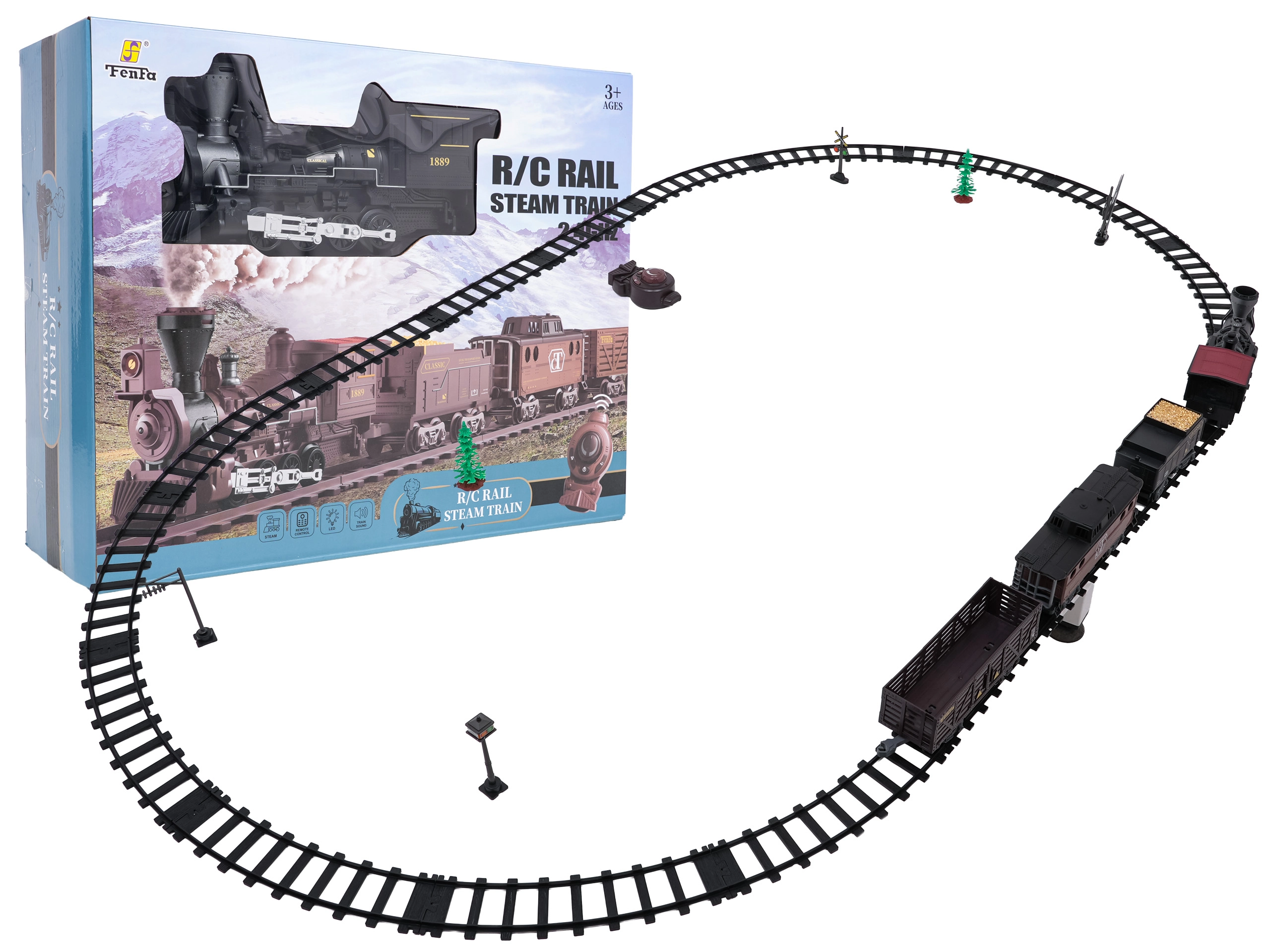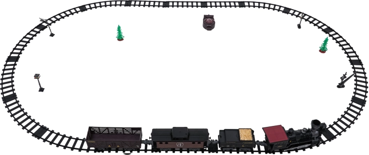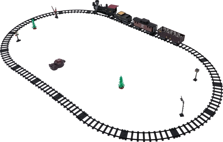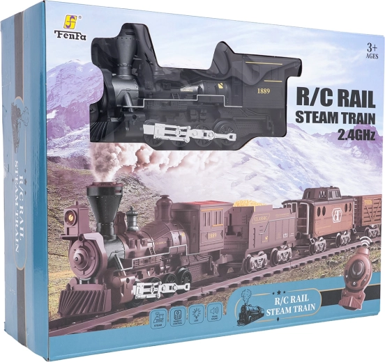 Telecomanda pe frecvența de 2,4 GHz asigură o conexiune stabilă fără interferențe. Poți schimba cu ușurință direcția de mers (înainte/înapoi), opri garnitura sau porni aburul printr-un singur buton. Setul include locomotivă, vagon de pasageri, tender cu cărbune și accesorii pentru o punere în funcțiune comodă.