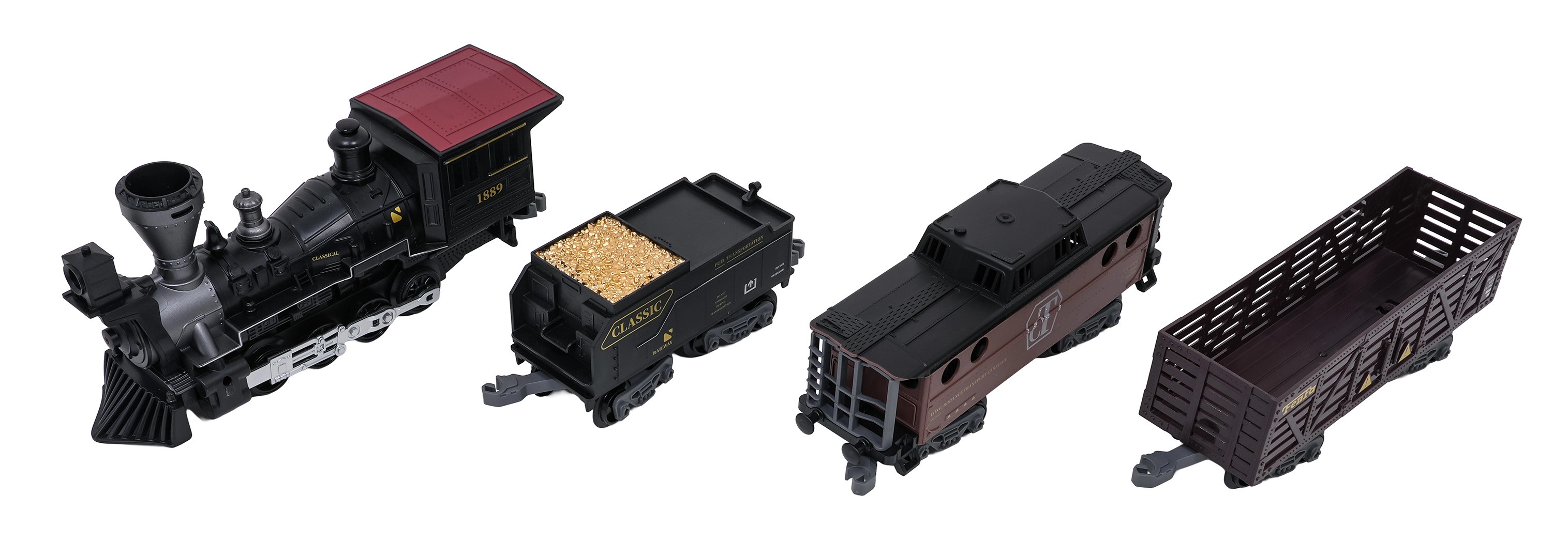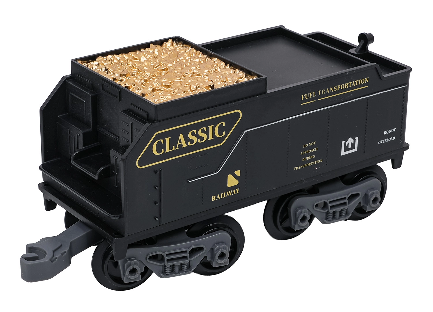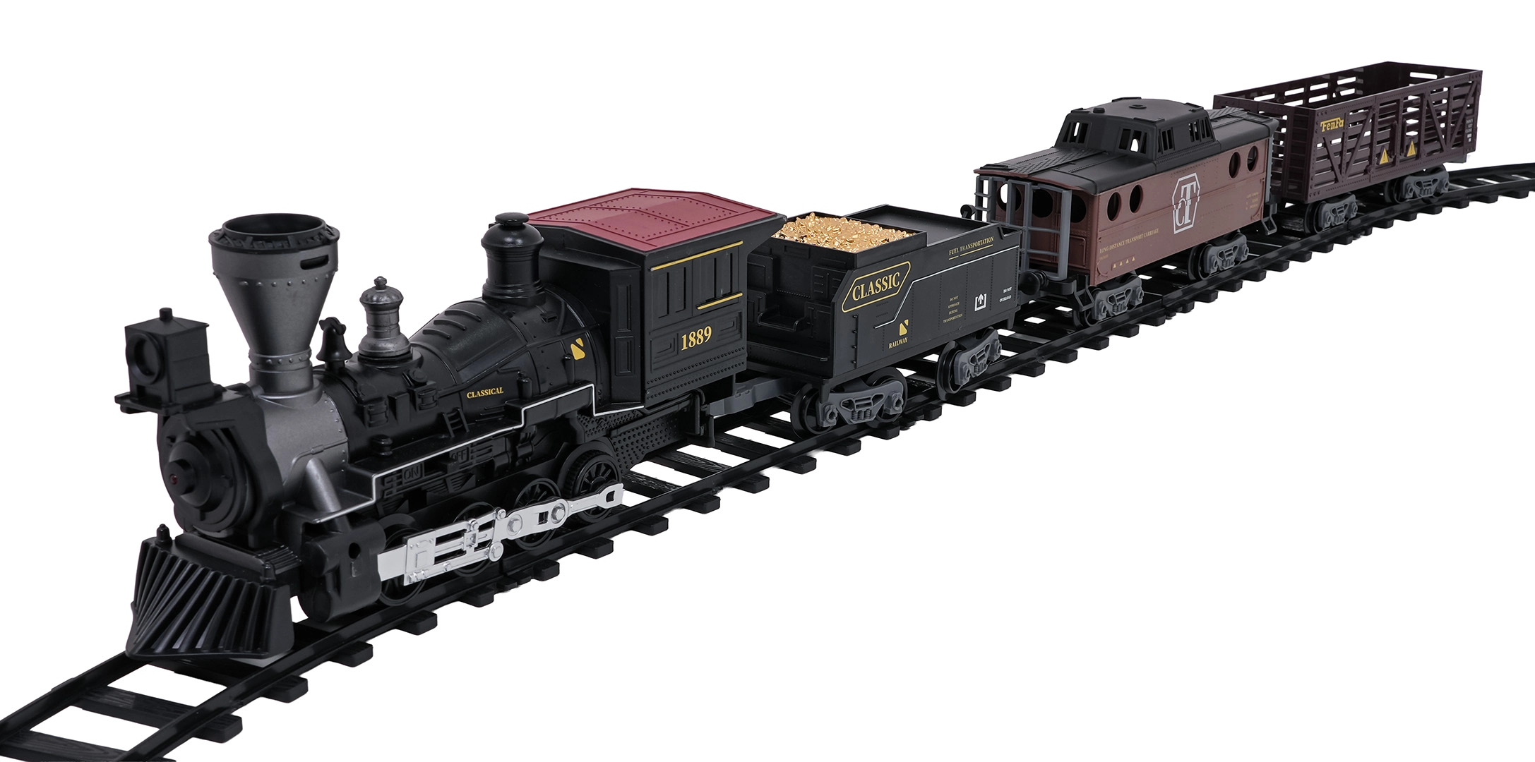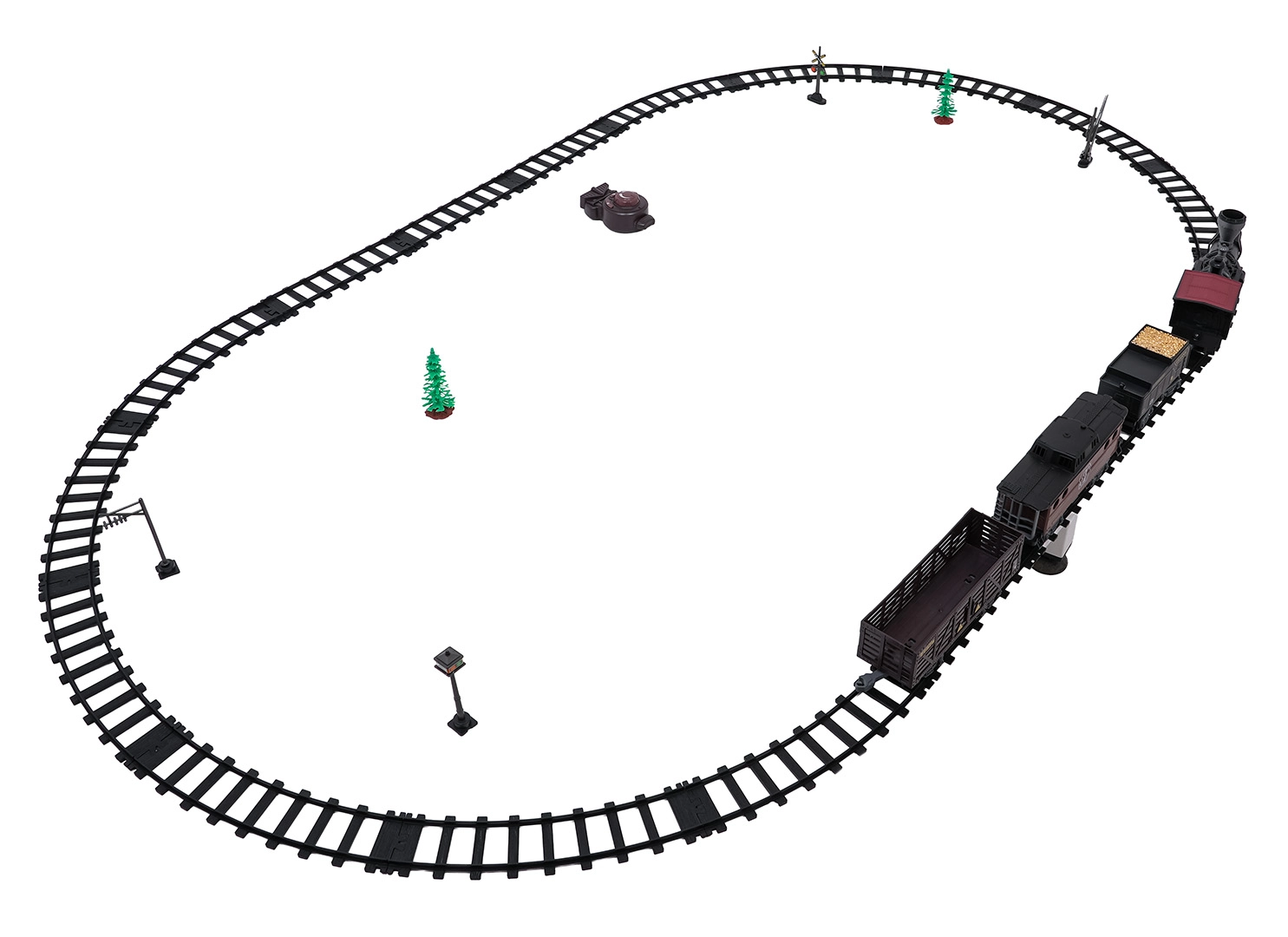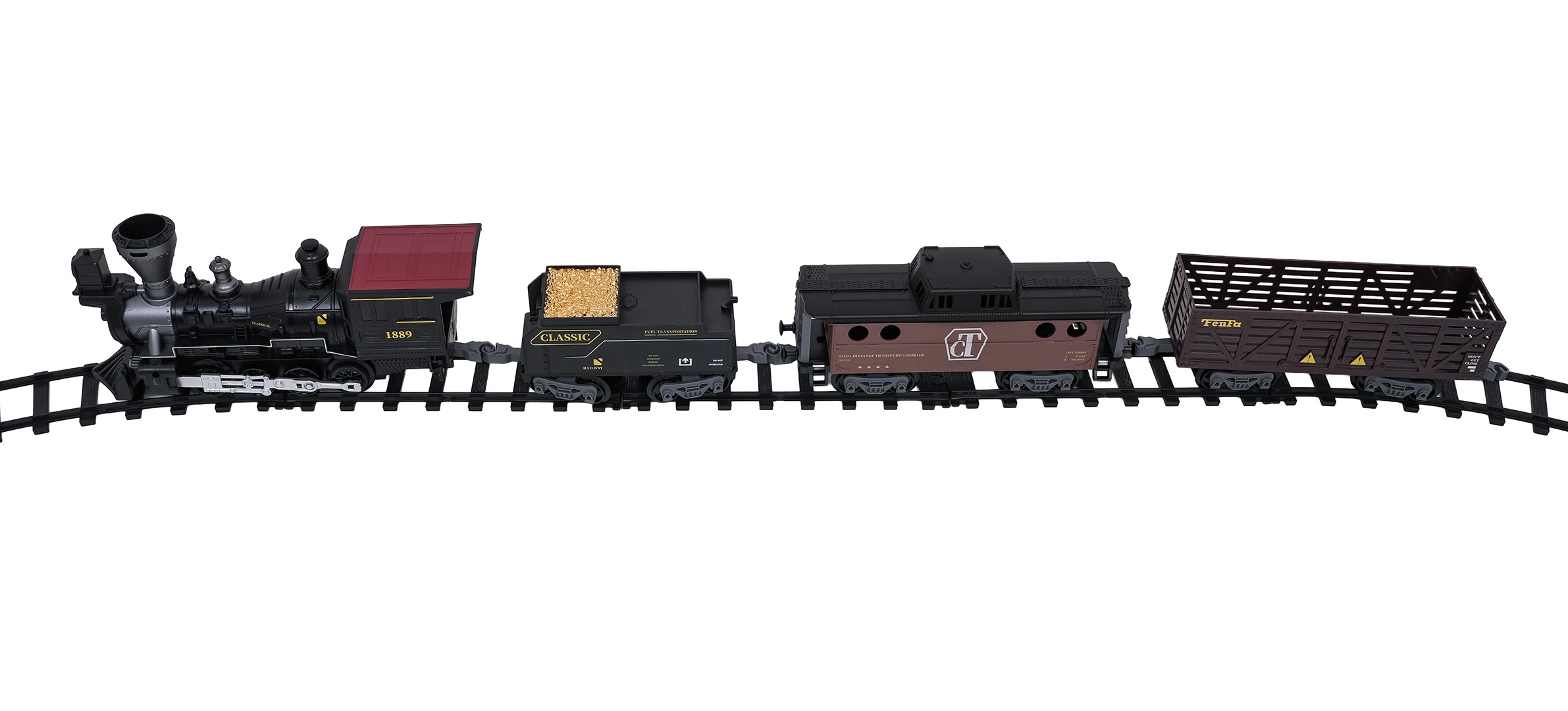 Trenulețul cu abur, stilat și bogat în detalii, îi va încânta pe micii și marii pasionați de căi ferate. Locomotiva, după completarea cu apă, creează un efect real de fum, în față luminează farul, iar în timpul mersului se aud sunete autentice, ce pot fi dezactivate la nevoie. Șinele din plastic rezistent se îmbină ferm și sunt sigure pentru copiii de la 3 ani.