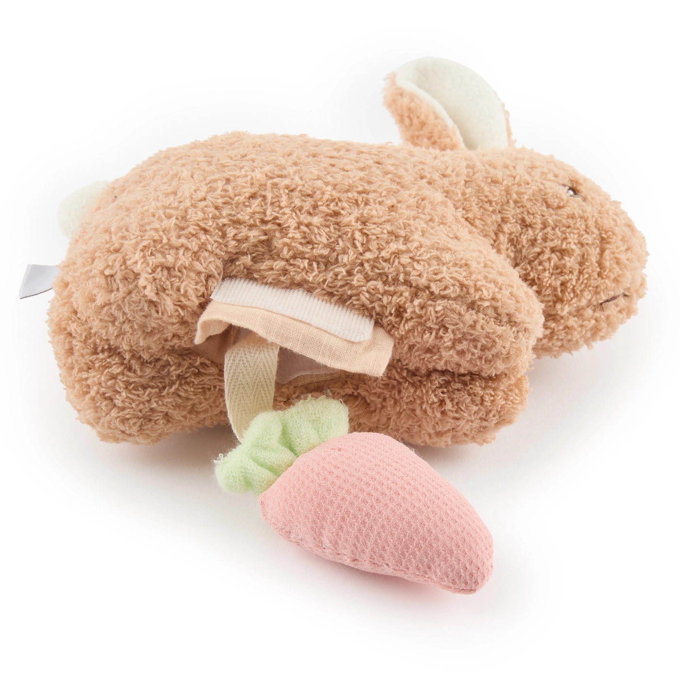 Morcovul detașabil din burtica iepurașului foșnește ușor la apăsare și îl motivează pe bebeluș să exploreze, să prindă și să descopere în mod repetat.