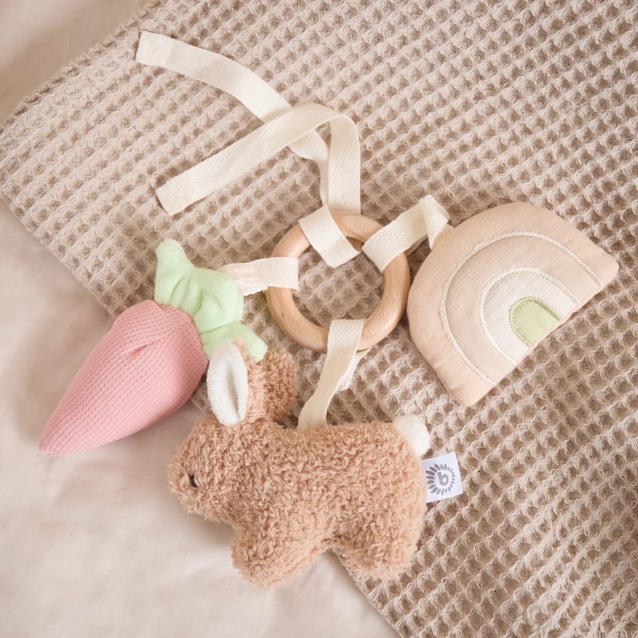 - Inel din lemn, curcubeu cu oglinjoară, morcov cu element scârțâitor și folie foșnitoare, iepuraș cu zornăitoare și folie foșnitoare