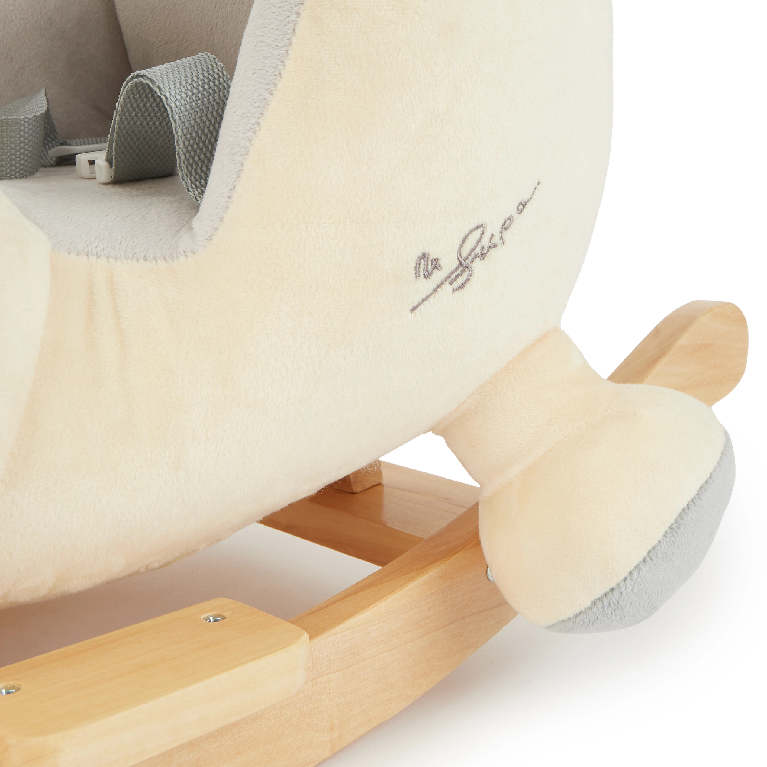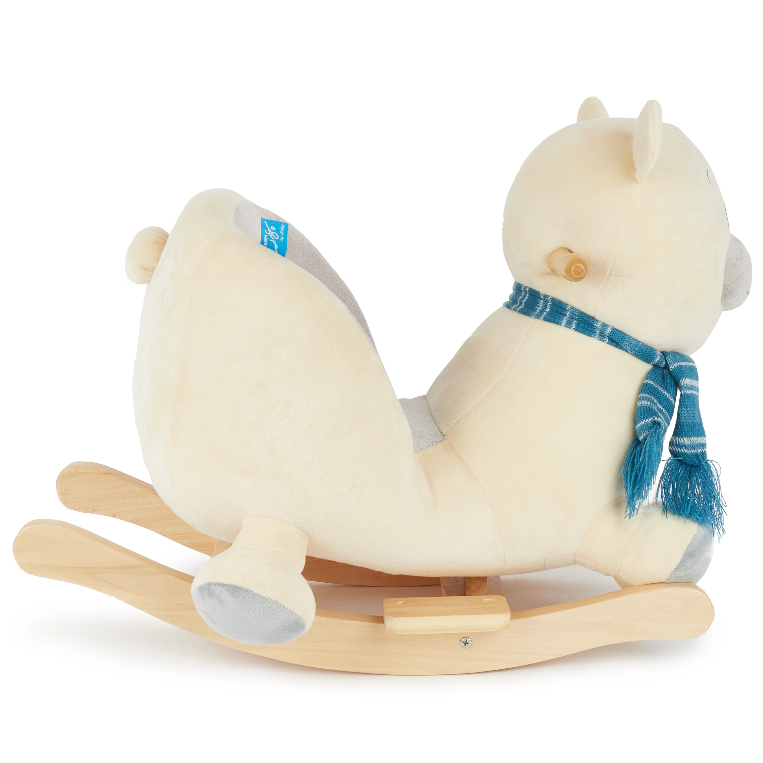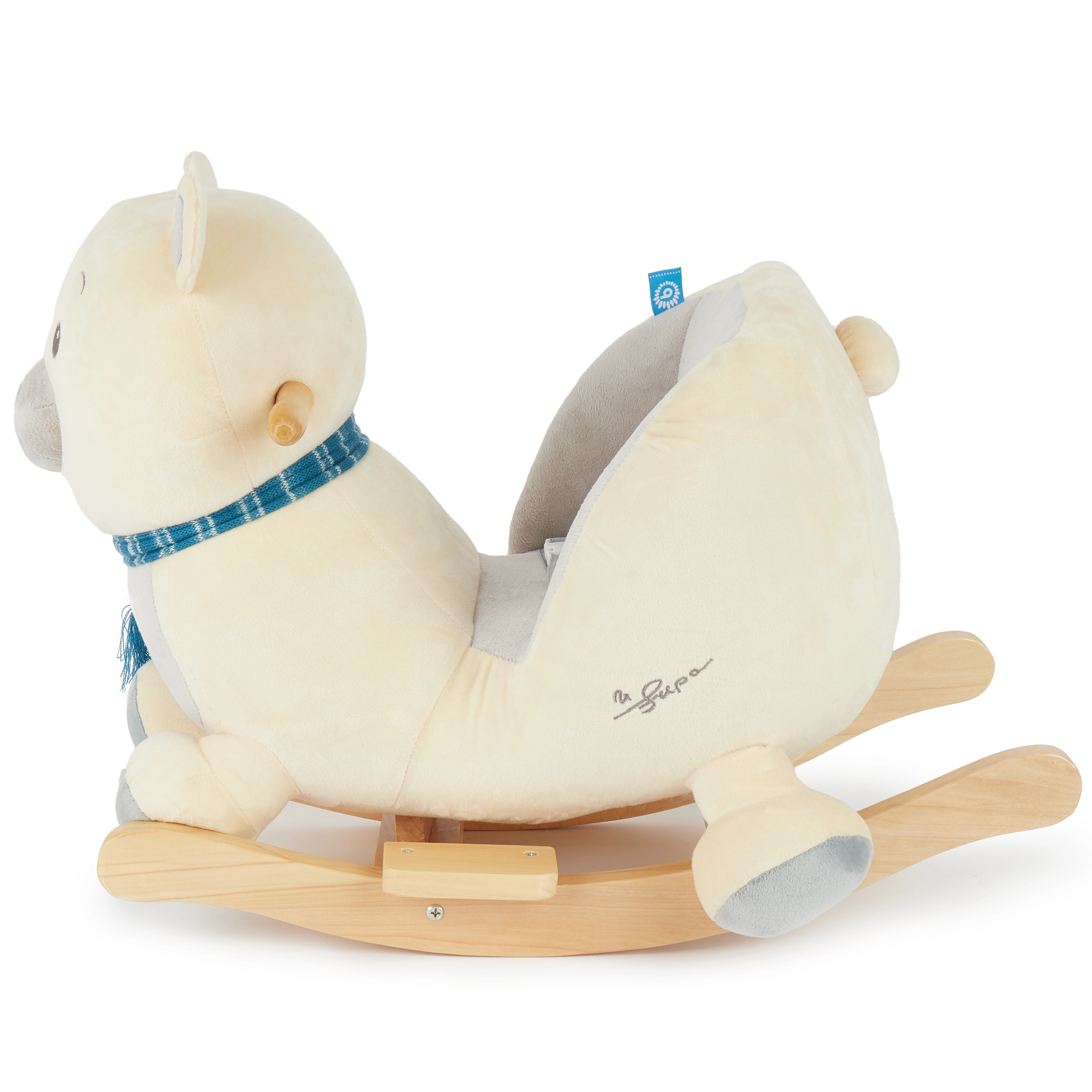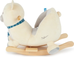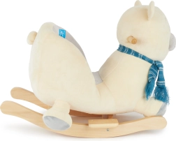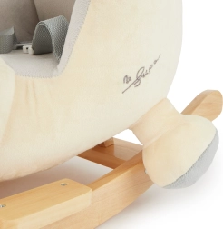 Baza solidă din lemn, cu protecție împotriva răsturnării, și scaunul moale, confortabil capitonat, cu centură de siguranță oferă siguranță maximă chiar și pentru cei mai mici. Suprafața catifelată din pluș va face ca cei mici să-și îndrăgească rapid noul prieten.