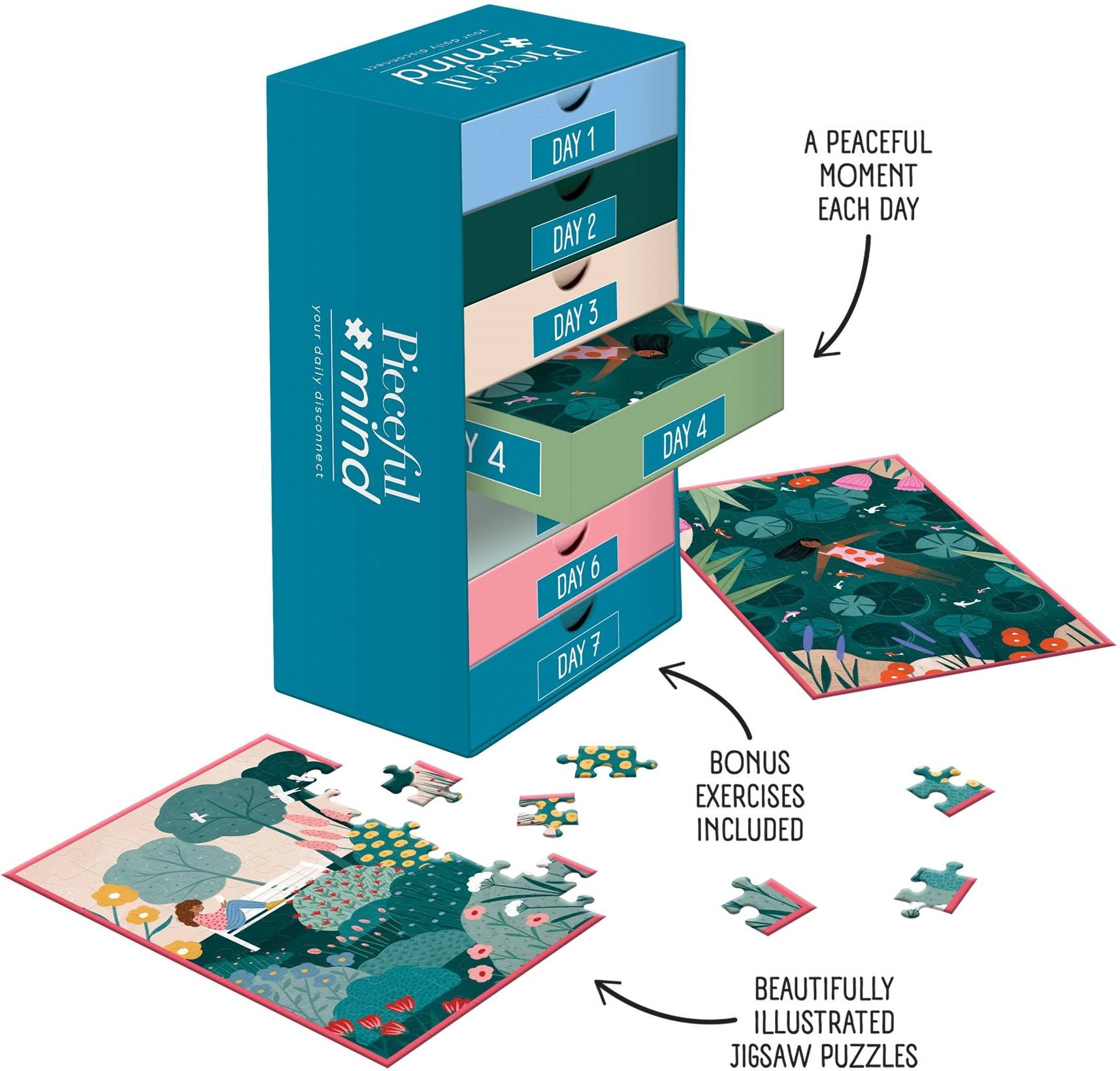 Creează-ți propria rutină zilnică de calm: în fiecare zi asamblează unul dintre cele șase motive inspirate din natură, iar la finalul săptămânii bucură-te de o dezvăluire surpriză. Puzzle-urile sunt concepute pentru a sprijini relaxarea, prezența conștientă și buna dispoziție.
