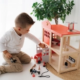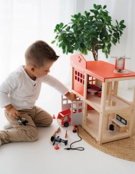 Transformă camera copilului într-un centru de salvare plin de acțiune! Această stație de pompieri din lemn, robustă, are două niveluri, platformă de aterizare cu elicopter și bară de coborâre. Sunt incluse figurine flexibile, mașină de pompieri și accesorii bogate. Atmosfera autentică este asigurată de modulul cu lumină și sunet cu sirenă, troliul funcțional al elicopterului și designul deschis pentru acces ușor. Jucăria dezvoltă motricitatea fină, imaginația și abilitățile sociale.