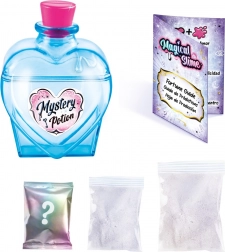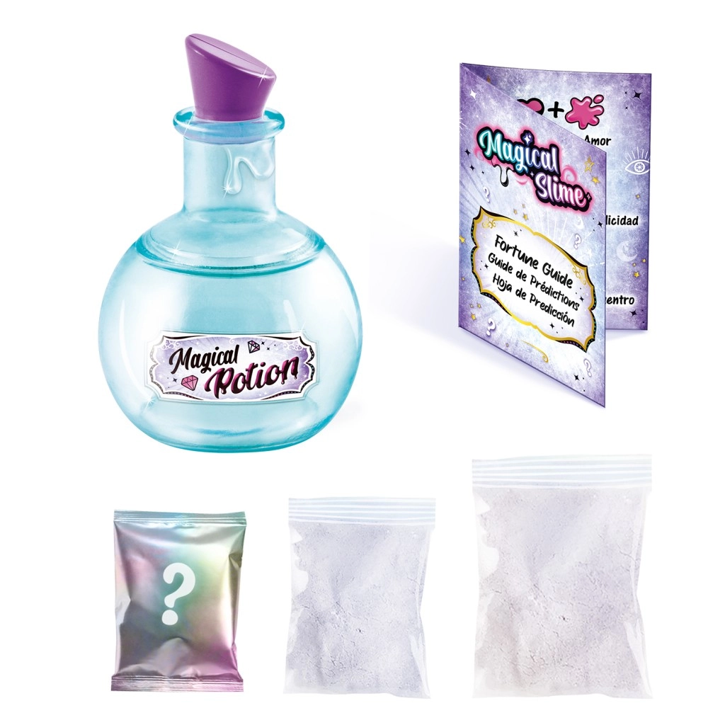 - Sticluță în formă de poțiune, amestecuri de pudre pentru slime, sclipici/confetti, cardă de previziuni, instrucțiuni