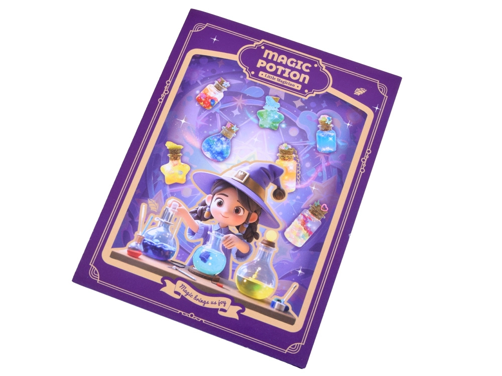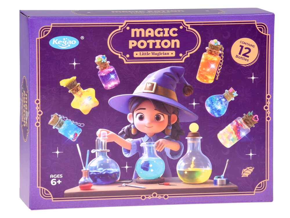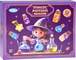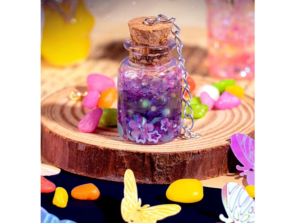 Setul pentru realizarea „elixirelor magice” transformă orice idee într-o mini creație strălucitoare. Doar toarnă sclipiciul și decorațiunile în sticluță, adaugă apă cu pigment, închide cu dopul de plută și decorează cu pandantive. Rezultatul poate fi un breloc, un talisman sau o drăguță decorațiune pentru cameră.