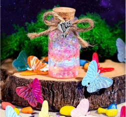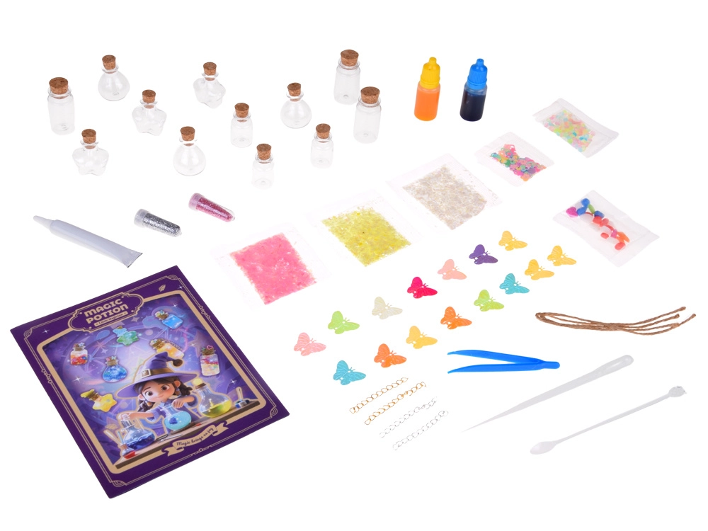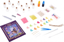Descoperă cât de ușor și distractiv este să creezi propriile poțiuni decorative! Acest set creativ pentru copii include mini sticluțe din sticlă cu dop de plută, sclipici, pigmenți, decorațiuni cu paiete, pandantive fluture și instrumente practice pentru dozare precisă. Copiii își exersează motricitatea fină, creativitatea și imaginația amestecând culori, umplând și decorând elixire magice.
